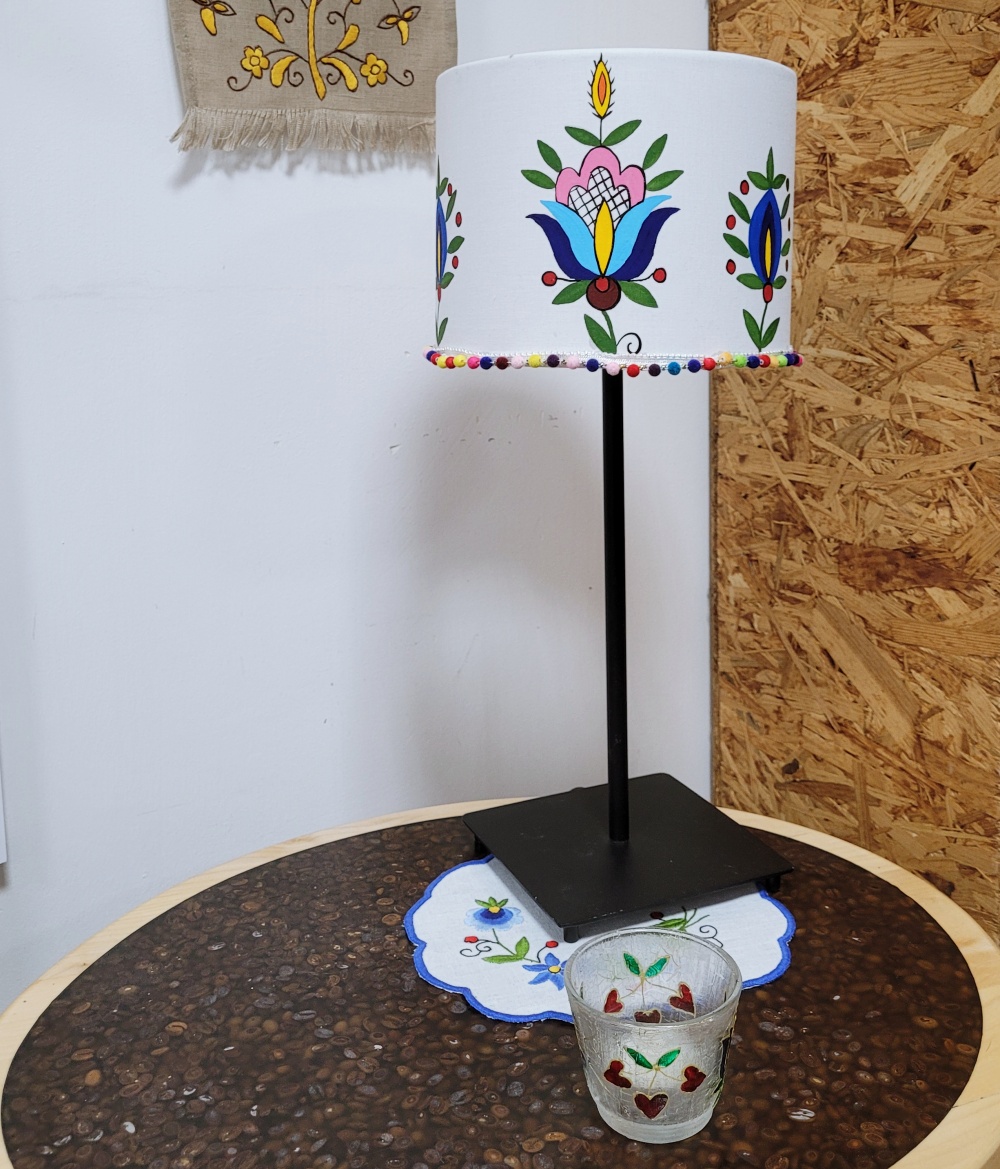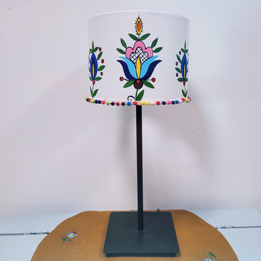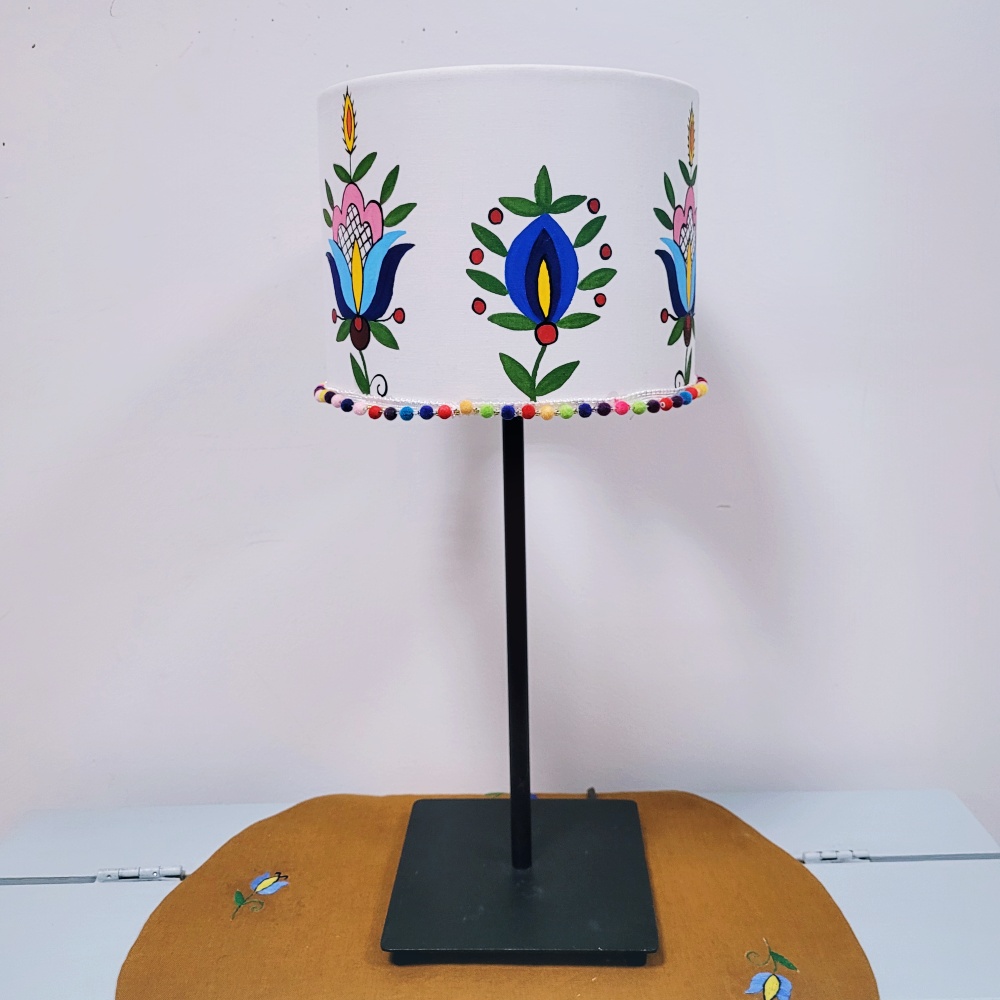 Klosz biały z ręcznie malowanym wzorem kaszubskim. Wzory haftu wdzydzkiego. Dodatkowo dodana kolorowa tasiemka z pomponami