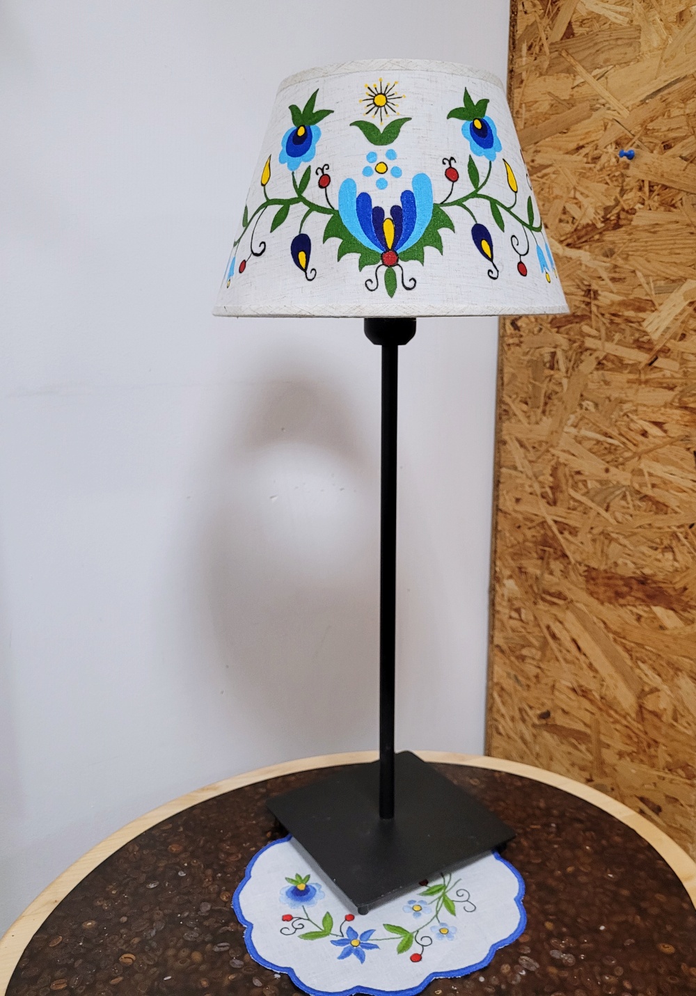 Klosz beżowy – len z ręcznie malowanym wzorem kaszubskim. Wzory haftu kaszubskiego – szkoła wejherowska.