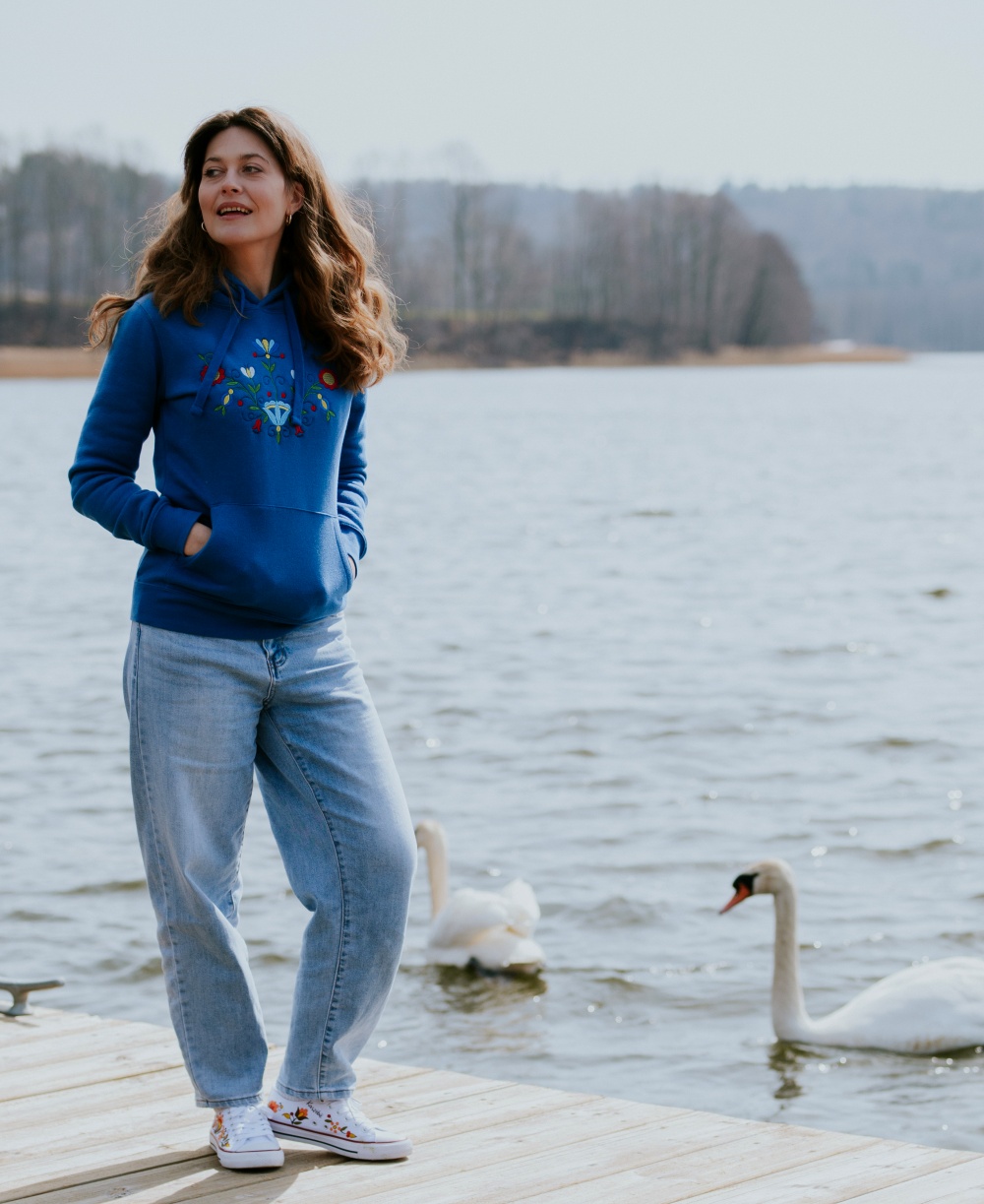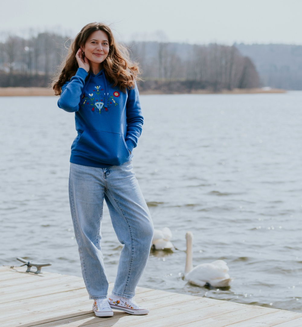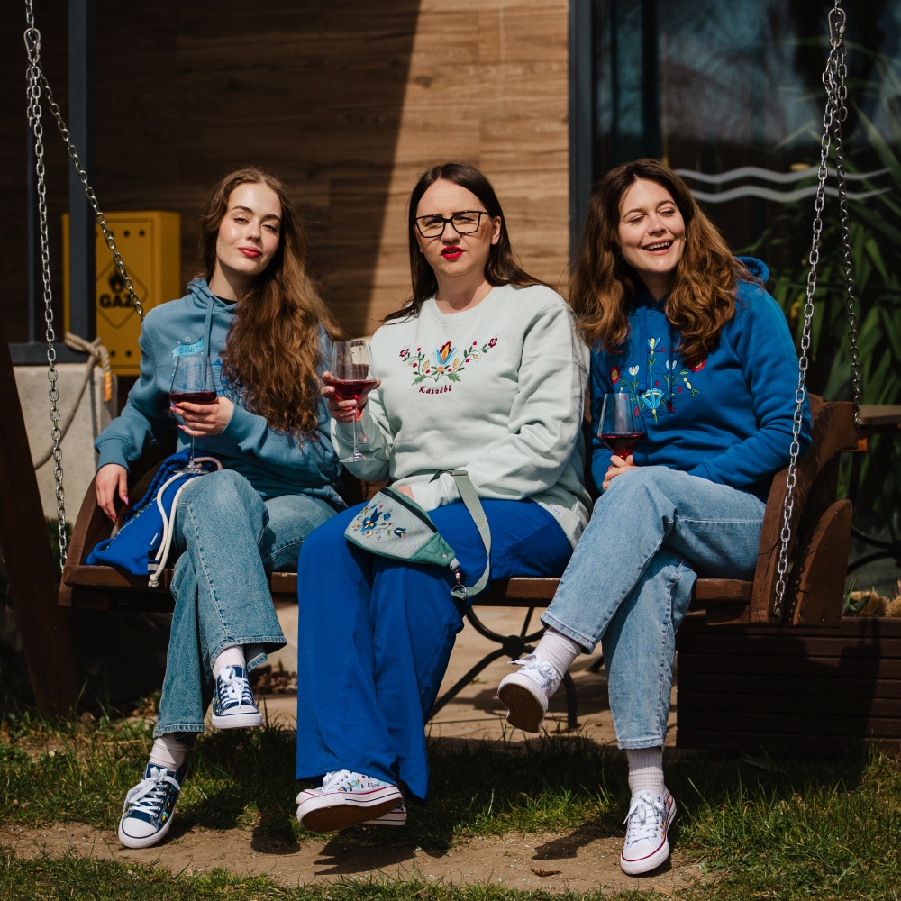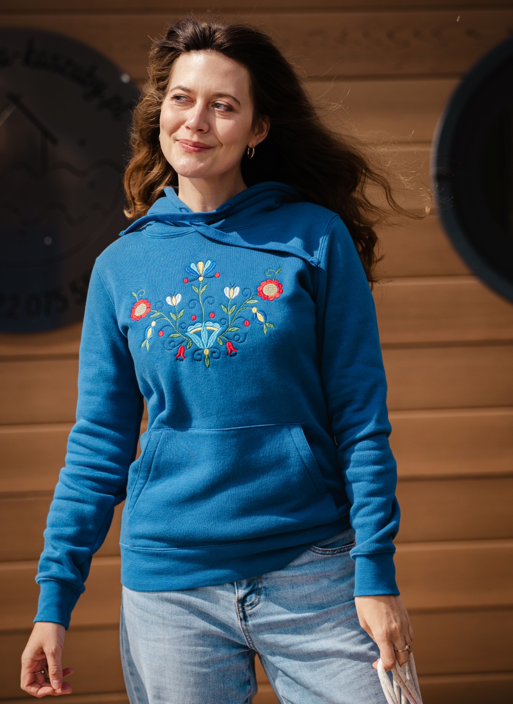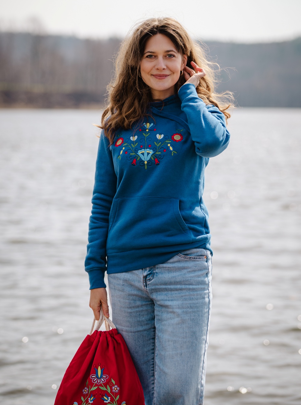 Bluzka dresowa z wyhaftowanymi kaszubskimi wzorami wykonana jest z grubej dzianiny.