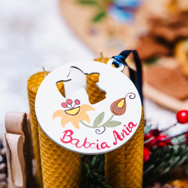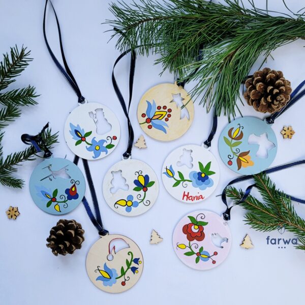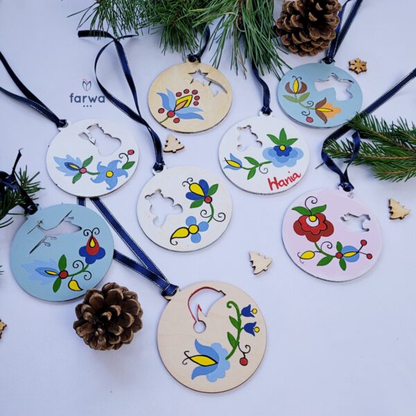 Piękne zawieszki dekoracyjne, ręcznie malowane we wzory haftu kaszubskiego z obu stron. Dzięki starannemu wykonaniu i intensywnym kolorom stanowią wyjątkową ozdobę, którą można zawiesić na choince, w oknie, na gałązce, przy prezencie lub w dowolnym miejscu w domu.