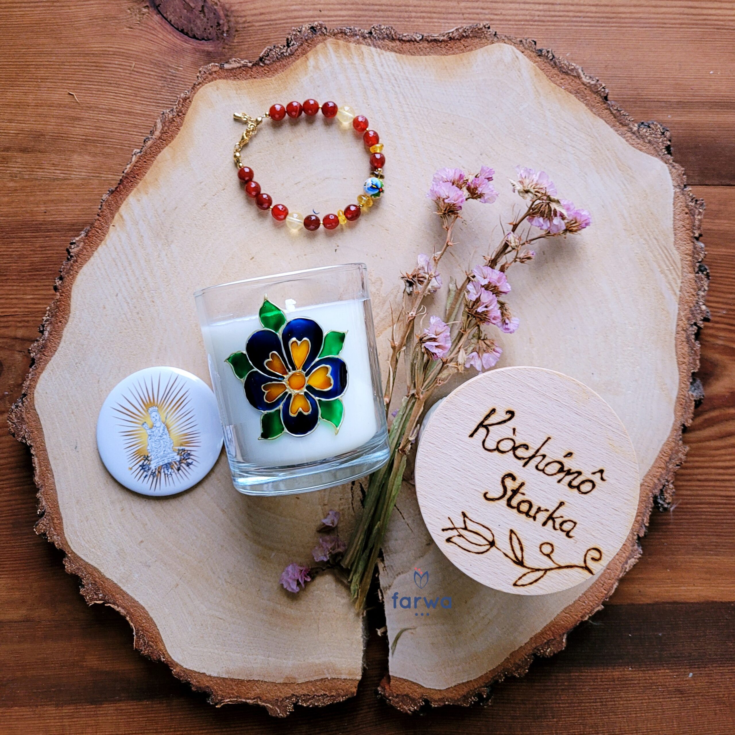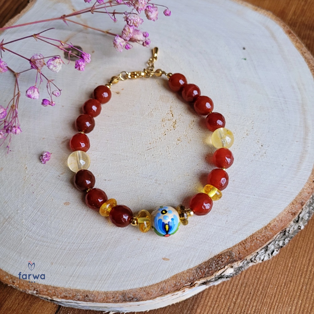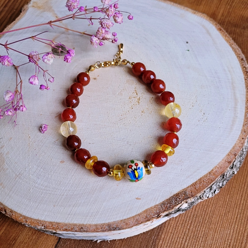 Bransoletka której dotyczy opis wykonana jest z naturalnych kamieni naturalnych i koralika drewnianego z ręcznie malowanym wzorem kaszubskim.