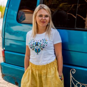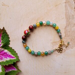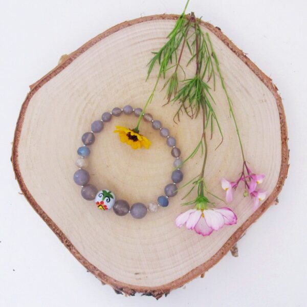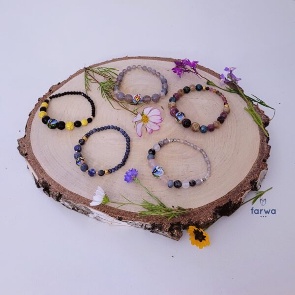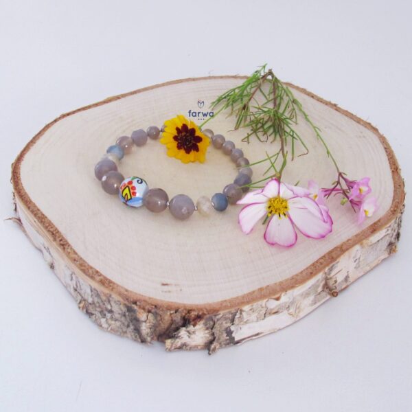 Delikatna Bransoletka na gumce z jednym koralikiem malowanym we wzory haftu kaszubskiego ( wzór wdzydzki na szarym tle) reszta koralików to kamienie naturalne: agat, jadeit… pomiędzy nimi są przekladki ze stali chirurgicznej.