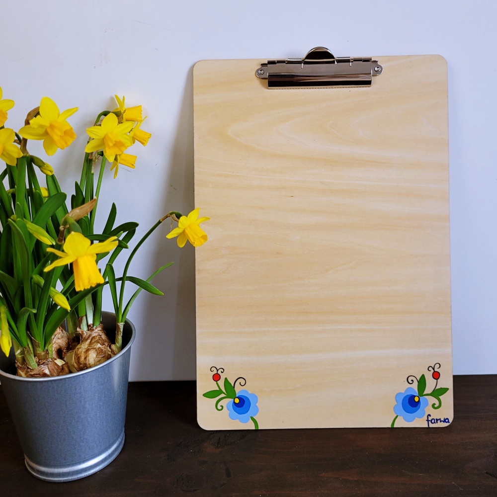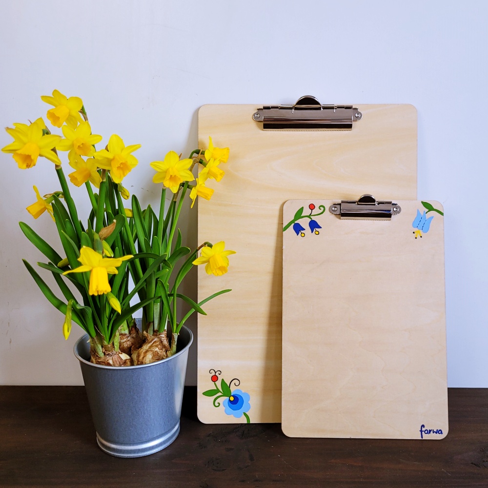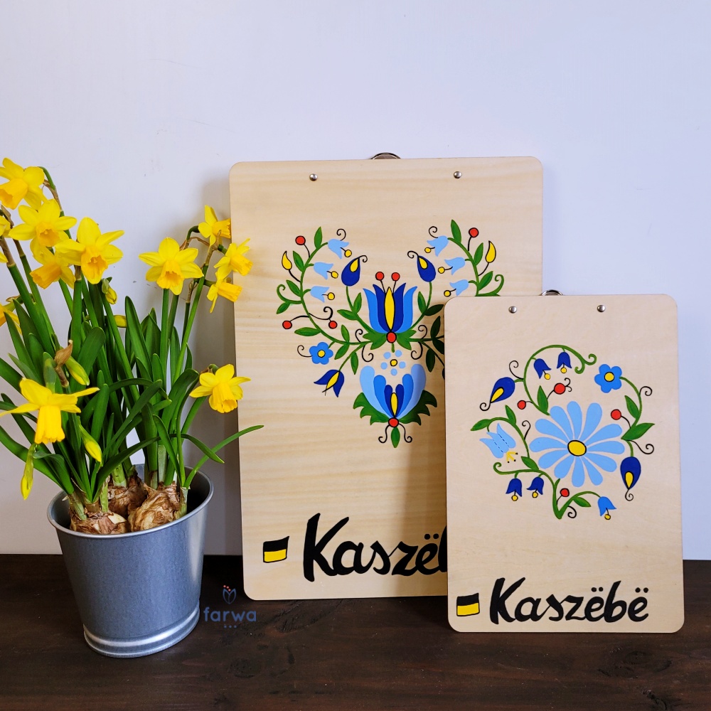 Główny, ręcznie malowany wzór kaszubski znajduje się na tylnej części clipboardu – dzięki temu jest doskonale widoczny dla innych, np. podczas prezentacji, pracy czy nauki. Z przodu, w dolnej części, umieszczono dwa subtelne, ręcznie malowane motywy kaszubskie, które elegancko dopełniają całość.
