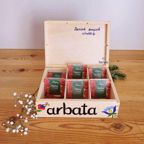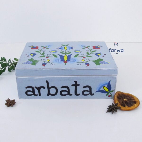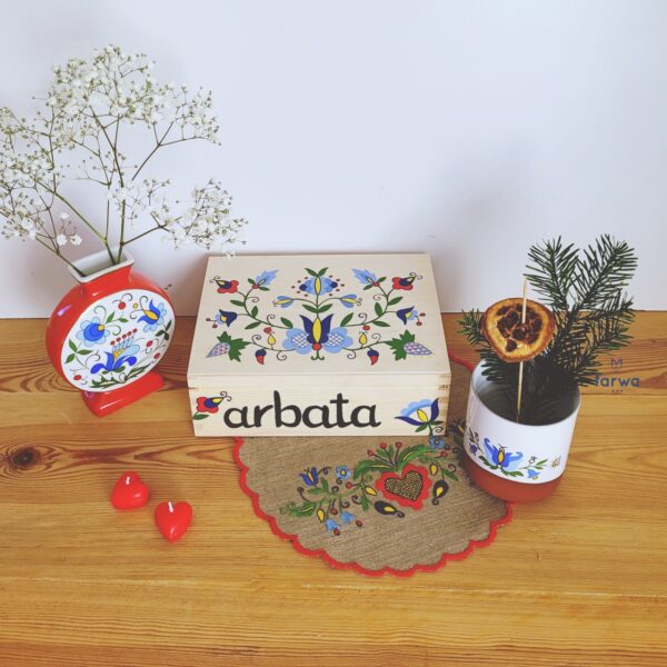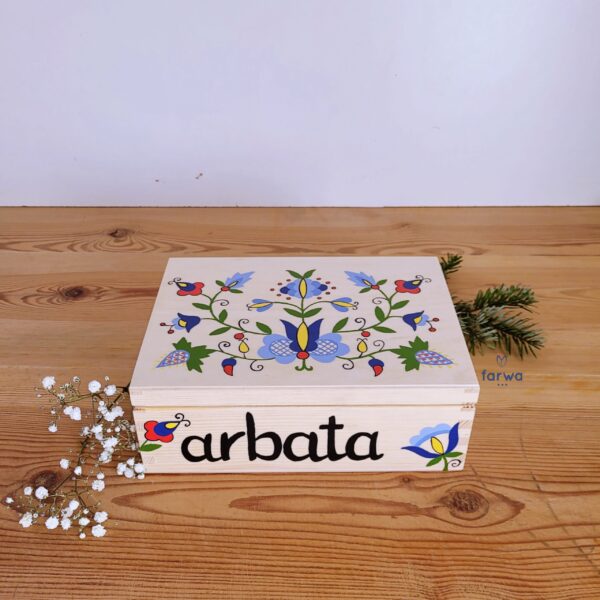 Drewniane pudełko "Arbata" - Herbata. Pudełko na herbatę z motywem kaszubskim - haft pucki na naturalnym drewnie.