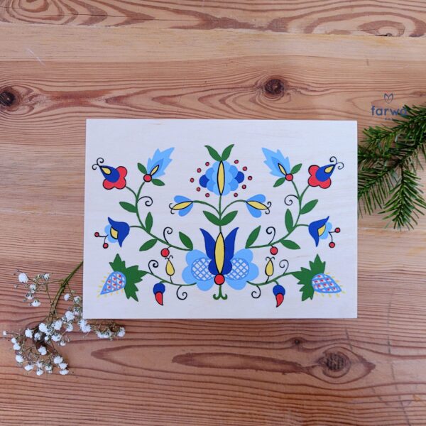 Wooden box for small items Kashubian motif on white, antiqued background. Hand painted with acrylic paints and protected with lacquer. External dimensions: L 22,5 cm x W 16,5 cm x H 7,5 cm.