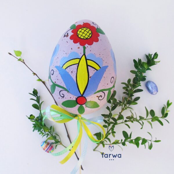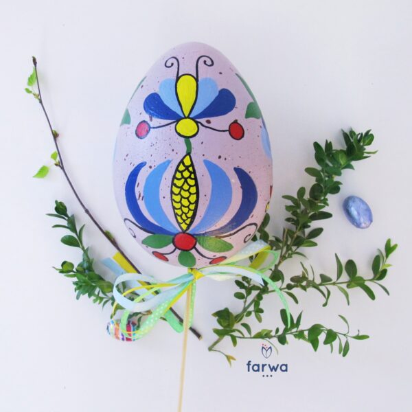 Easter Egg, made of polystyrene, hand-painted in patterns Kashubian. 12cm height, width 8cm. Placed on a wooden stick.
