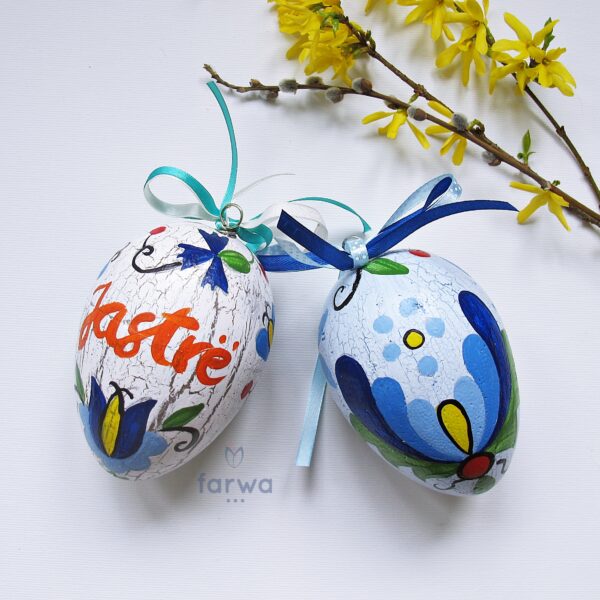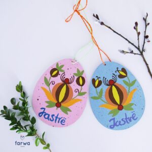 Jajko Wielkanocne, wykonane ze styropianu, ręcznie malowane we wzory Kaszubskie. Wysokość 15 cm, szerokość 10 cm. Zawieszone na wstążce.