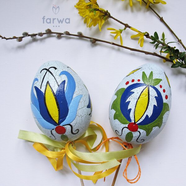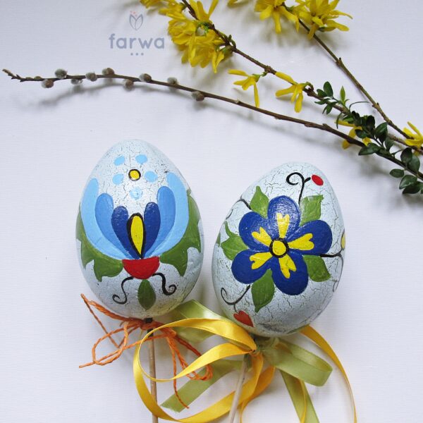 Easter Egg, made of polystyrene, hand-painted in patterns Kashubian. 12cm height, width 8cm. Placed on a wooden stick.