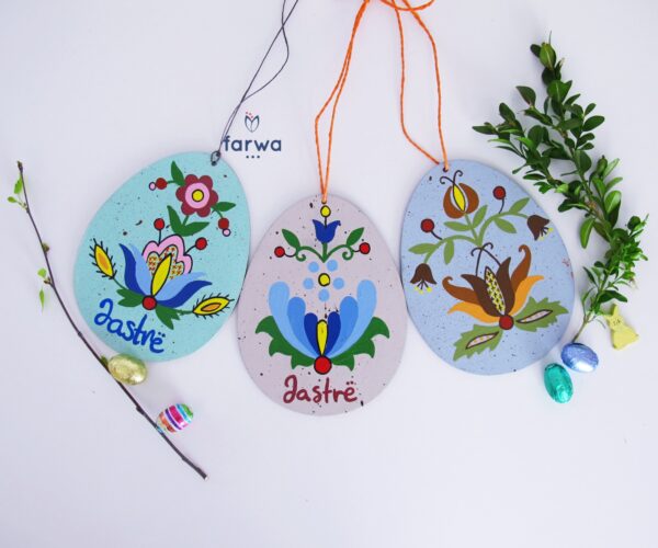 Jajko Wielkanocne, wykonane ze sklejki, ręcznie malowane we wzory Kaszubskie.