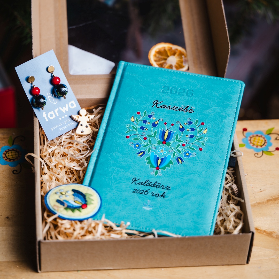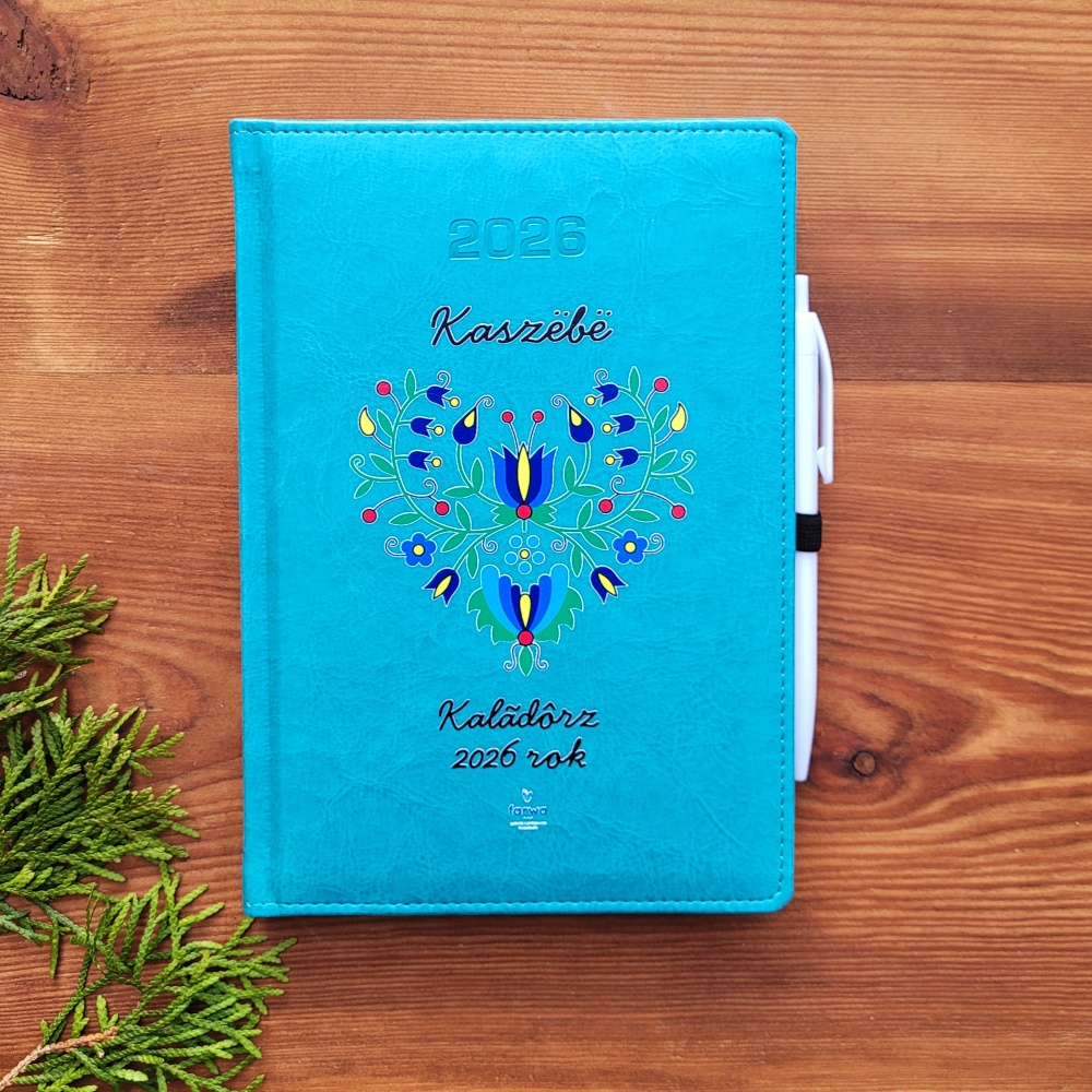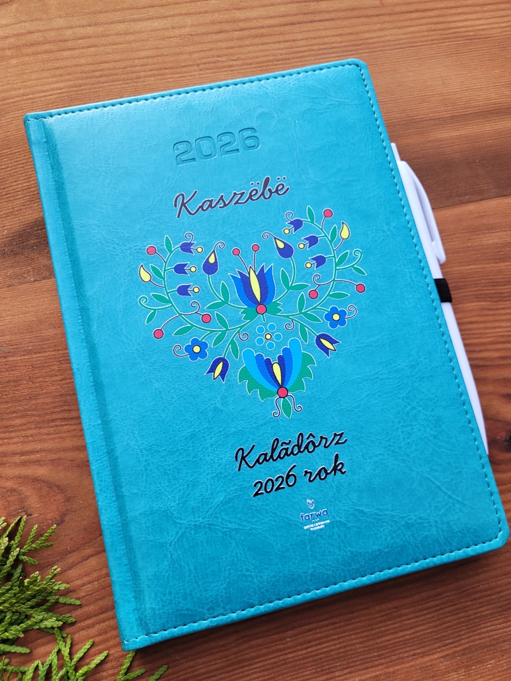 Praktyczny kalendarz tygodniowy w formacie A5 (książkowym), zaprojektowany z myślą o codziennym użytkowaniu i miłośnikach kaszubskiego wzornictwa. Okładka została ozdobiona trwałym nadrukiem UV przedstawiającym autorski wzór „Farwy Serce”, uzupełniony napisem Kaszëbë oraz Kalãdôrz 2026.