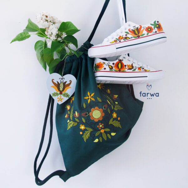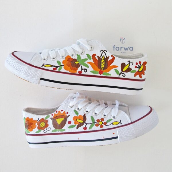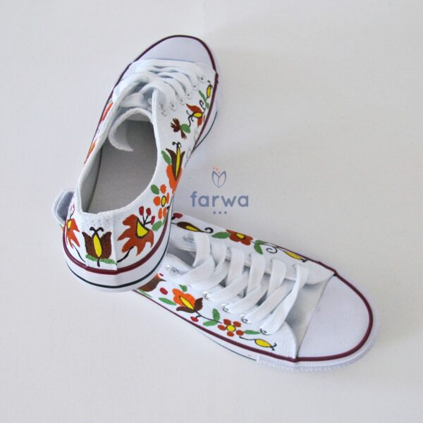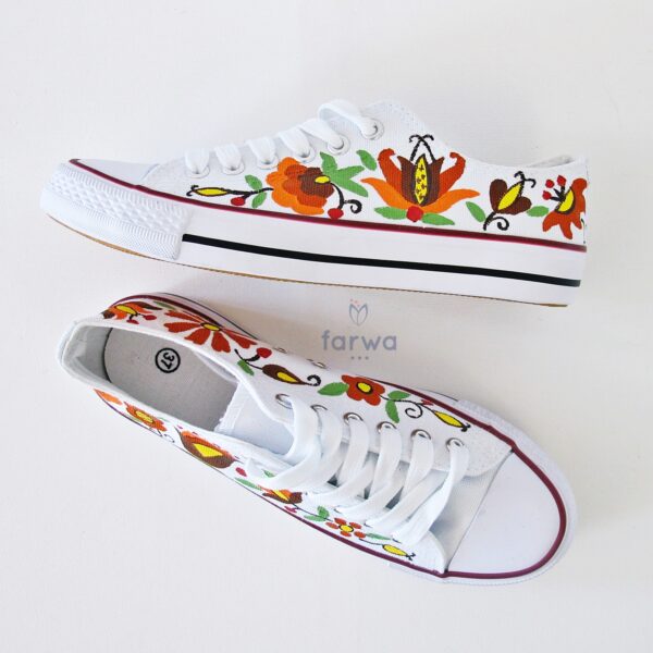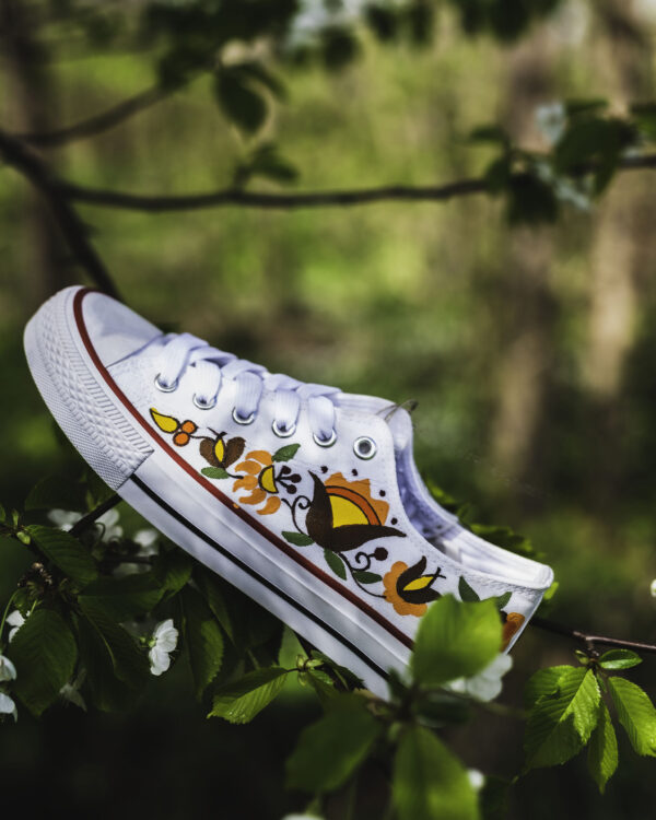 Niepowtarzalne trampki z niską cholewką powstały z solidnego, białego płótna, które stanowi idealne tło dla ręcznie malowanych motywów borowiackich. Malowanie przy użyciu trwałych farb do tkanin gwarantuje intensywność kolorów oraz odporność na ścieranie podczas codziennego użytkowania. Elementy wzoru kaszubskiego utrzymane są w żywej palecie: pomarańcz, żółty, zielony, brązowy, czerwony i czarny tworzą wyrazisty kontrast z jasnym tłem buta. Starannie wykonane pociągnięcia pędzla nadają każdej parze niepowtarzalny charakter – każda sztuka jest unikatowa.
