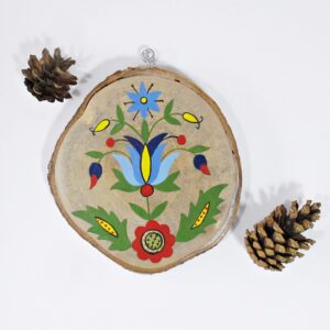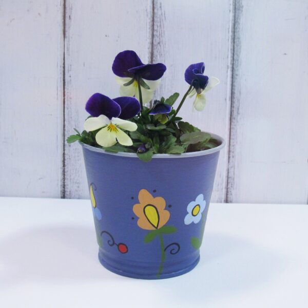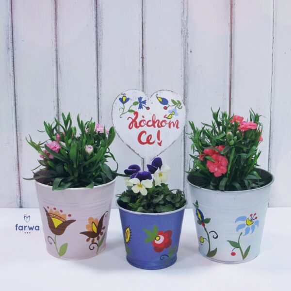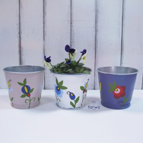 Metalowa osłonka na roślinkę , malowana we wzory haftu kaszubskiego. Kilkakrotnie lakierowana, co umożliwia jej czyszczenie.