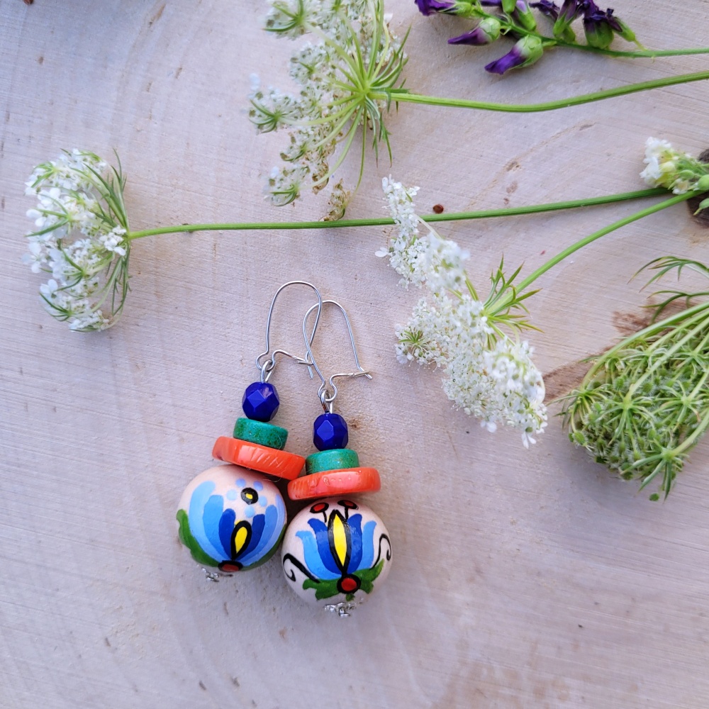 Kolczyki z jedną kulą czarną z ręcznie malowanym wzorem kaszubskim 2 różne wzory na kulce, średnica kuli 15mm ,pastylki koralu, awenturyn i agat, zawieszona na srebrnym biglu.