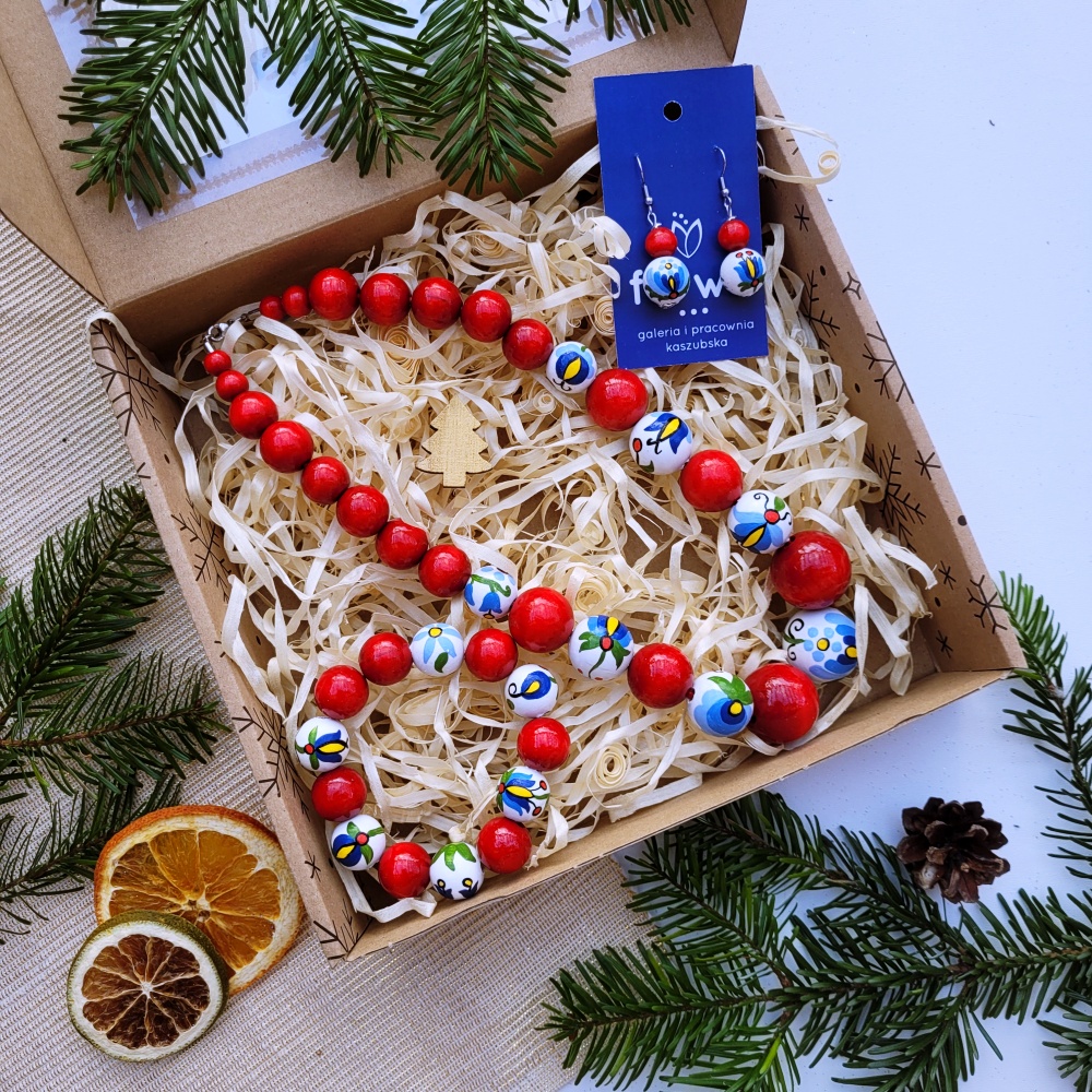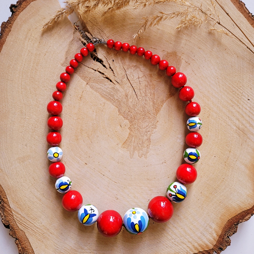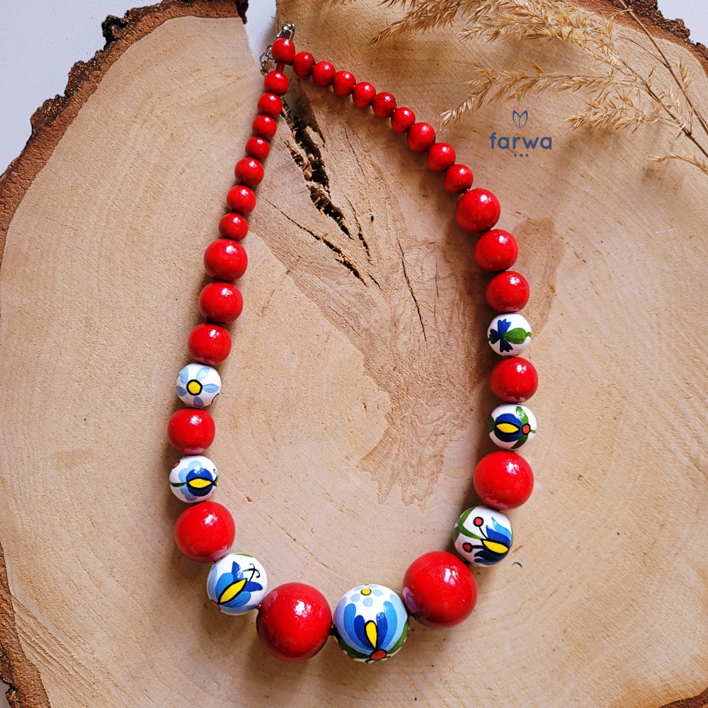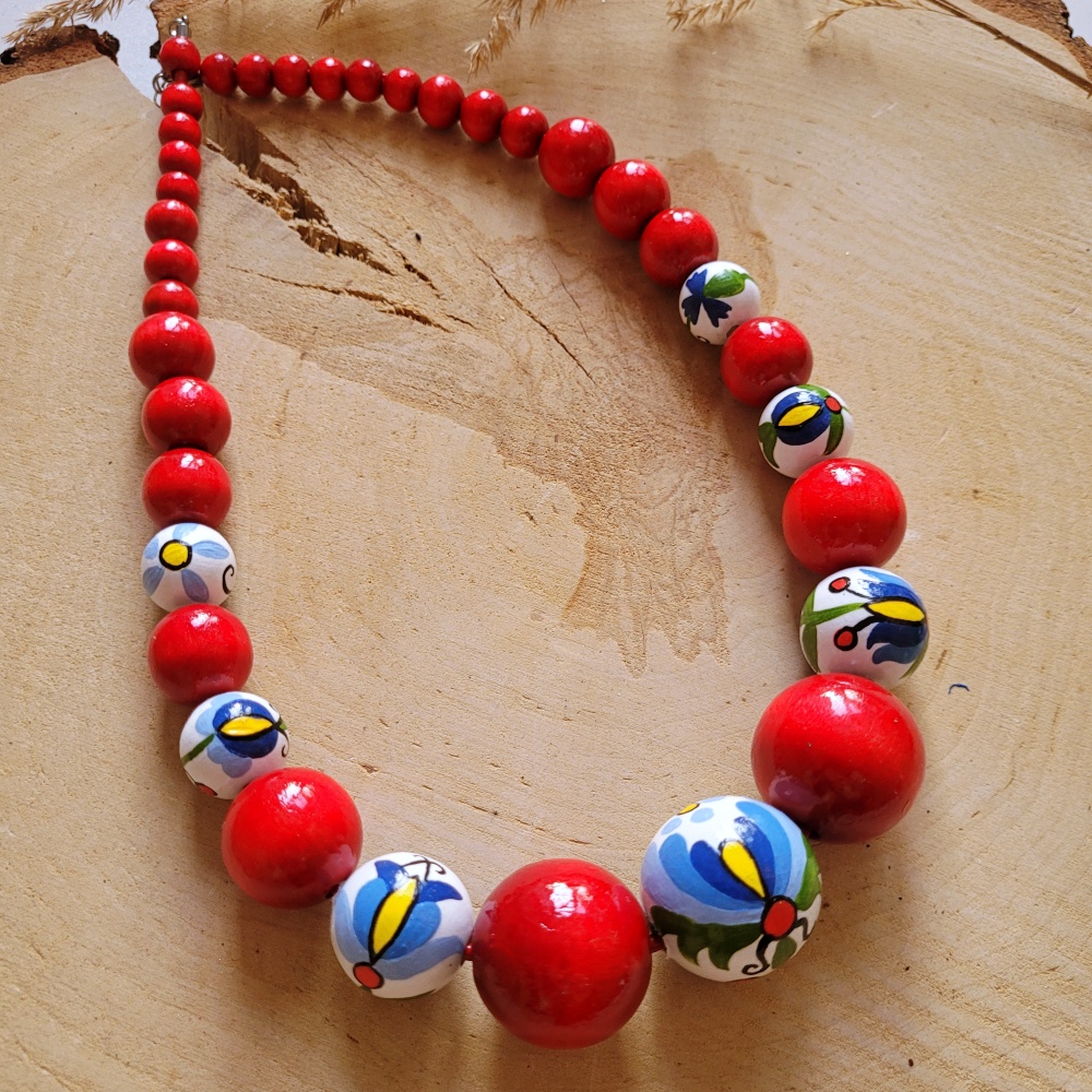 Wyjątkowe korale kaszubskie, starannie ręcznie malowane, zachwycające intensywnością kolorów i niepowtarzalnym charakterem. Największe kule mają średnicę ok. 3 cm, co nadaje biżuterii wyrazisty i efektowny charakter.