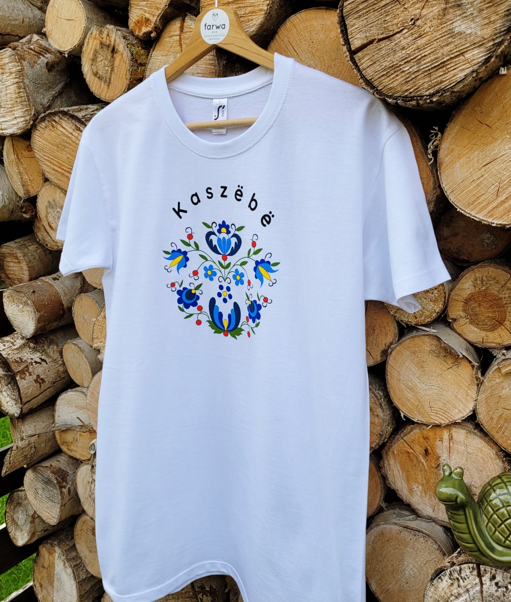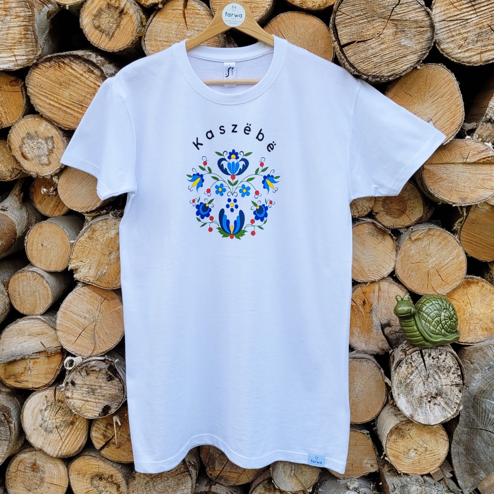 Stylowa koszulka z wyjątkowym wzorem inspirowanym tradycyjnym haftem kaszubskim. Centralnym elementem jest motyw kaszubski wkomponowany w koło, uzupełniony napisem „Kaszëbë” – Kaszuby, który podkreśla dumę i tożsamość regionalną.