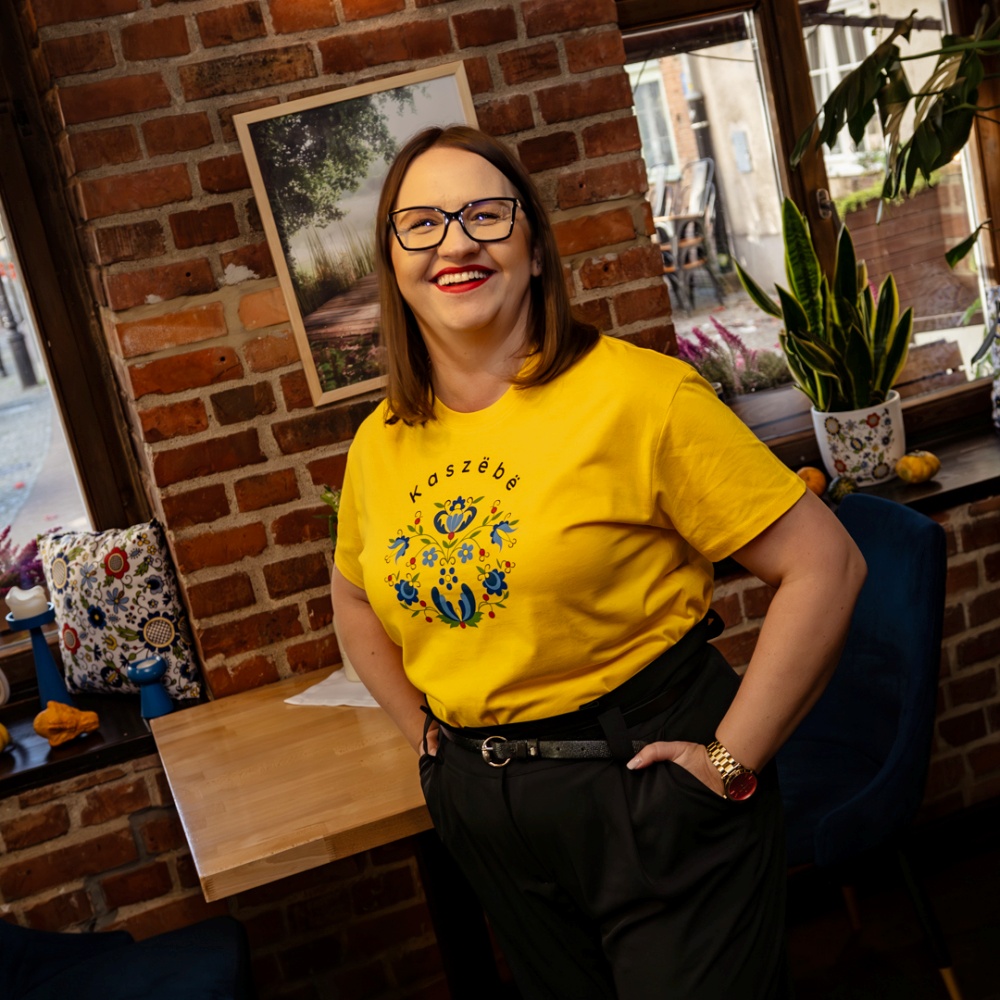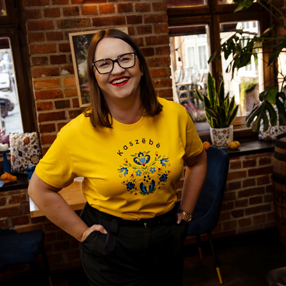 Koszulka została zaprojektowana na modelu unisex, dzięki czemu doskonale pasuje zarówno kobietom, jak i mężczyznom. Dostępna w dwóch klasycznych kolorach – białym i żółtym – sprawdzi się zarówno na co dzień, jak i jako wyjątkowy prezent dla miłośników kultury kaszubskiej.