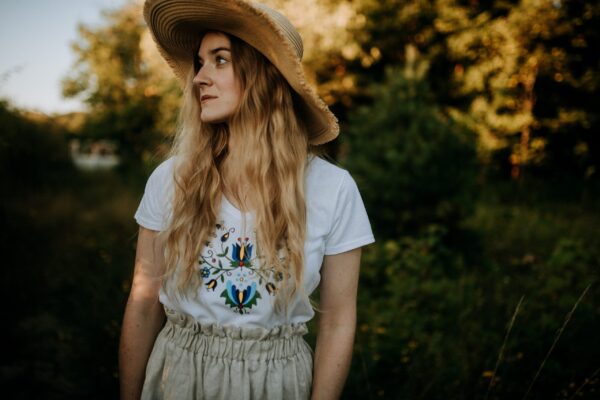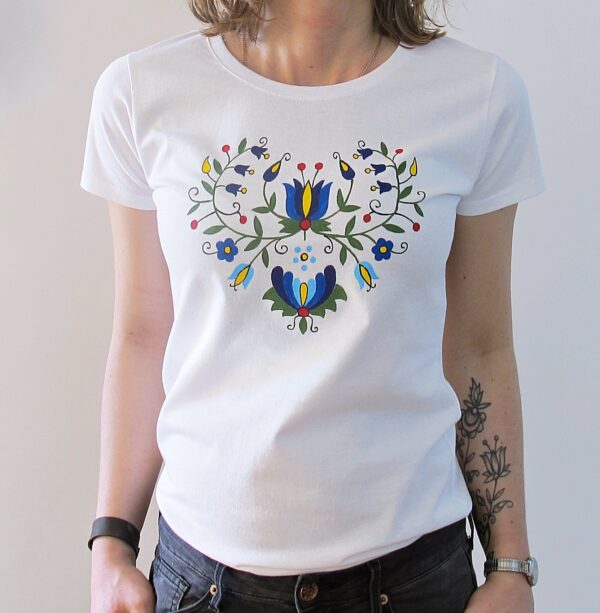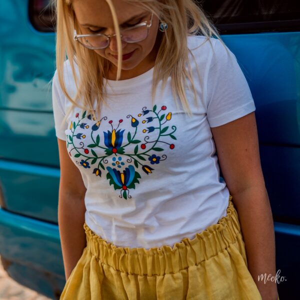 Graceful, feminine, cotton t-shirt. Adorned with Kashubian embroidery design. It was painted with special paints for fabric. The inks are very durable and do not get dirty clothes. T-shirt is made of good quality cotton. Size 36 It is washable at 40 degrees / manual /.