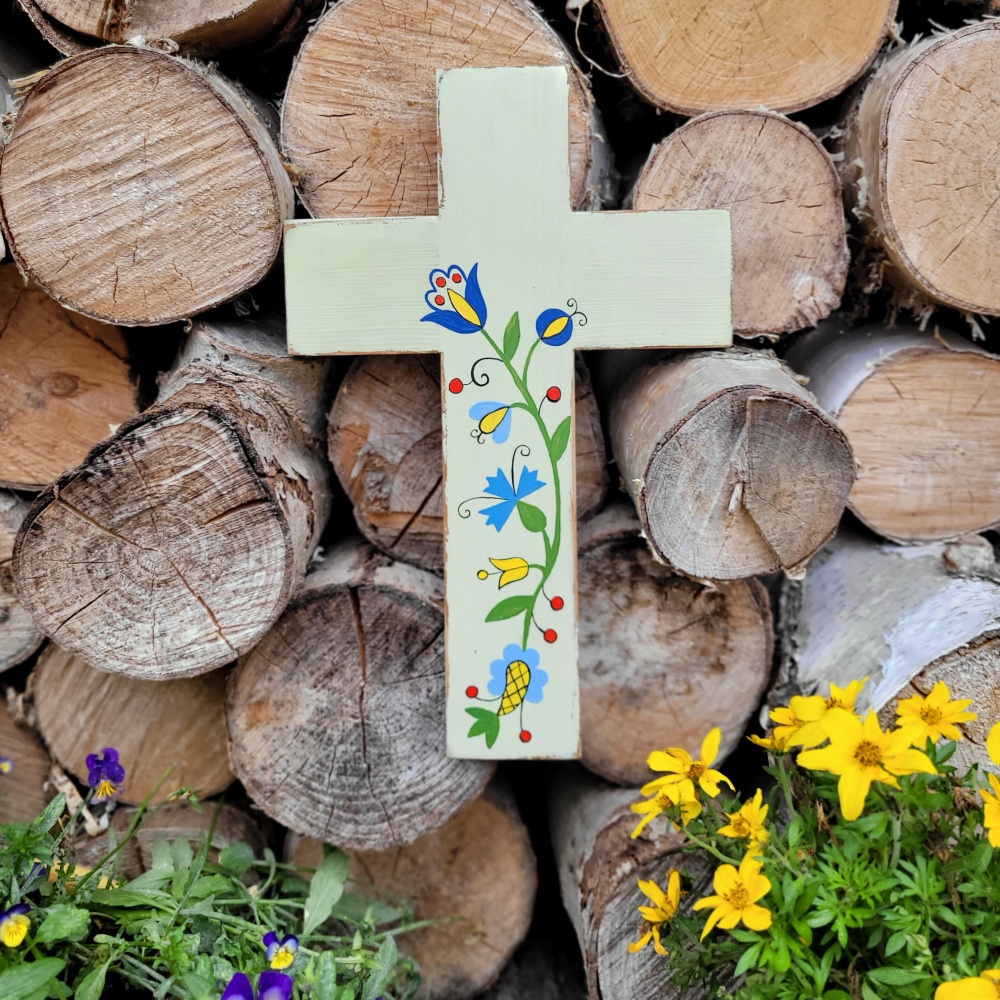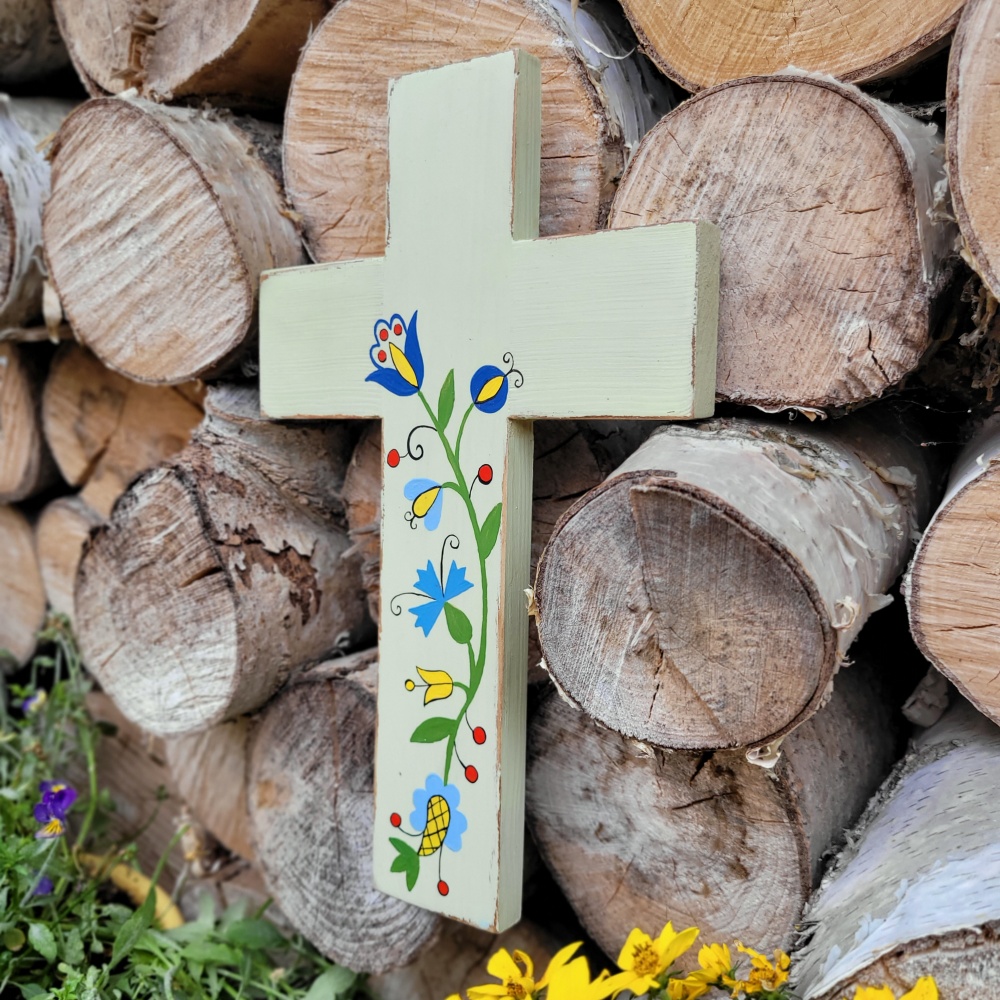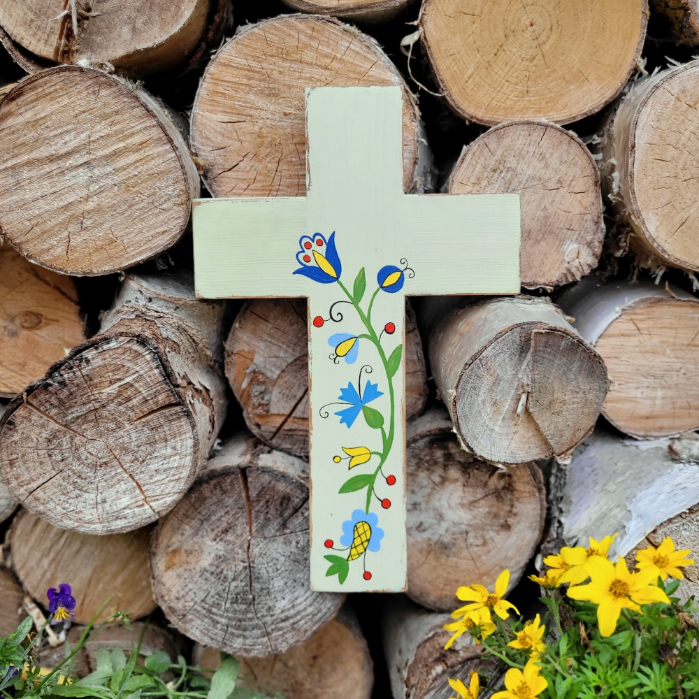 Wyjątkowy krzyż wykonany ręcznie przez stolarza z litego drewna sosnowego. Zdobiony tradycyjnymi wzorami haftu kaszubskiego wejherowskiego, malowany z dbałością o każdy detal. Całość została pokryta lakierem ochronnym, który zabezpiecza drewno i kolory.