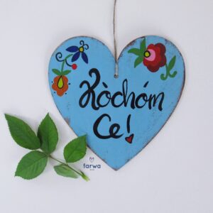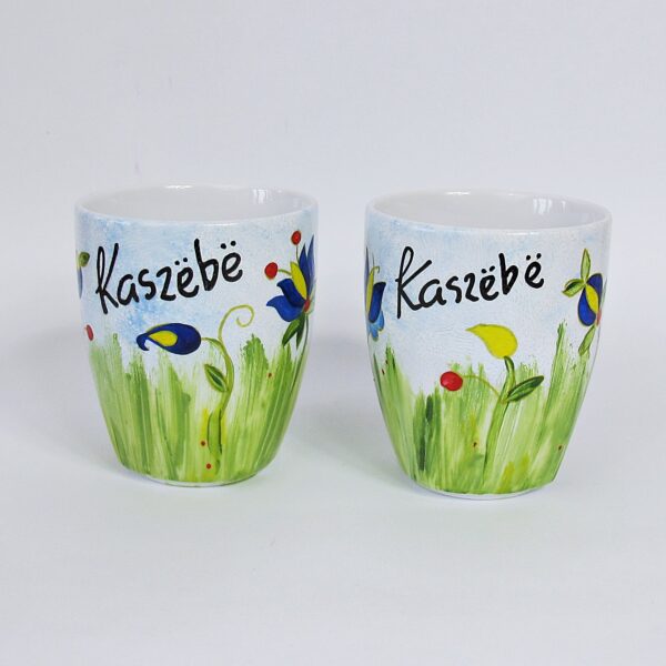 Kubek ręcznie malowany z napisem i we wzory haftu kaszubskiego "Kaszëbë"