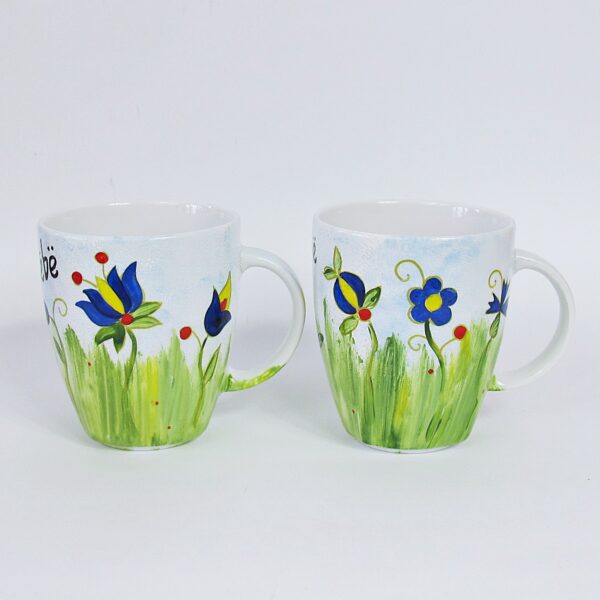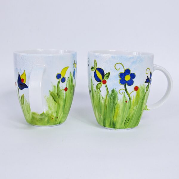 Kubek wykonany z białej porcelanie, ręcznie malowany, utrwalony termicznie. Przeznaczony do użytku codziennego, zalecane mycie ręczne. Profesjonalna technologia zdobienia porcelany zapewnia jej nietoksyczność i trwałość. Przedmiot malowany jest specjalnymi farbami do porcelany.