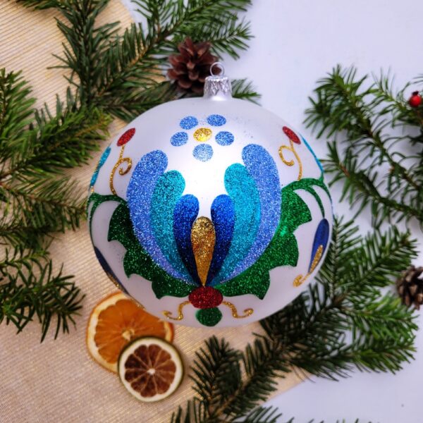 Kùgla – Bombka kaszubska brokatowa – biały/srebrny mat – duża 15 cm