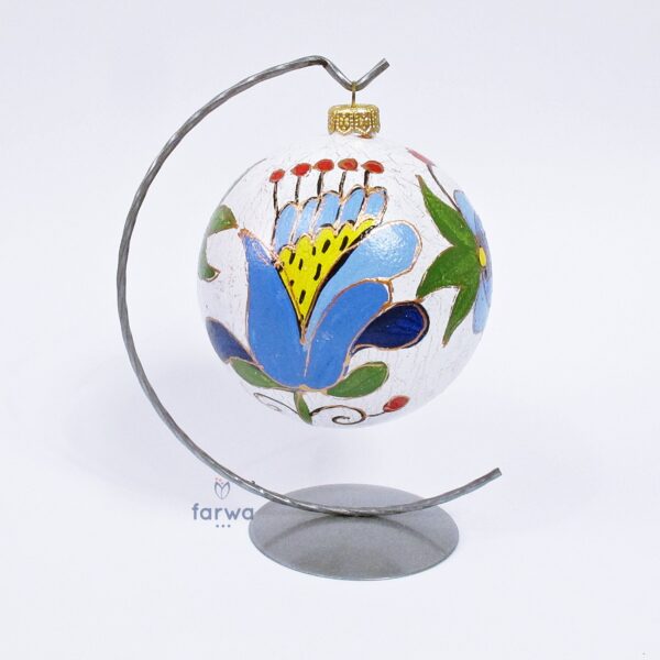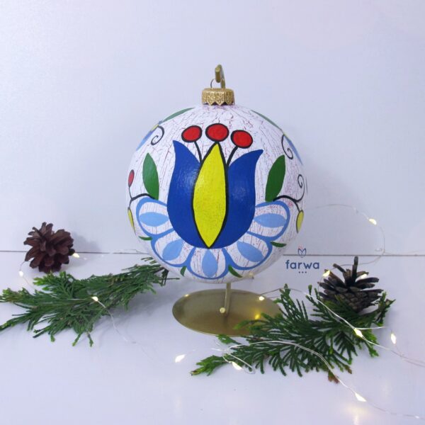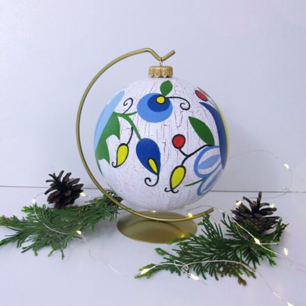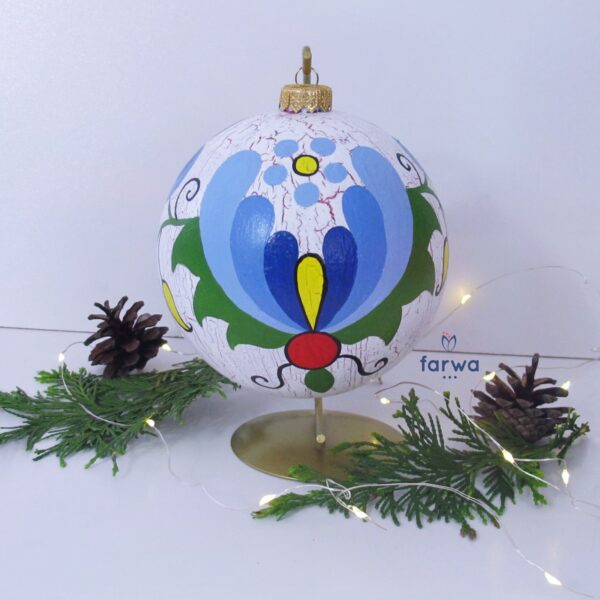 Bombka kaszubska, każdy zdobiący ją motyw został wykonany ręcznie, dzięki czemu nie tylko osiągnęliśmy ich niepowtarzalny charakter, ale zgodnie z przyświecający nam celem – kontynuujemy tradycyjną sztukę polskiego rękodzieła.