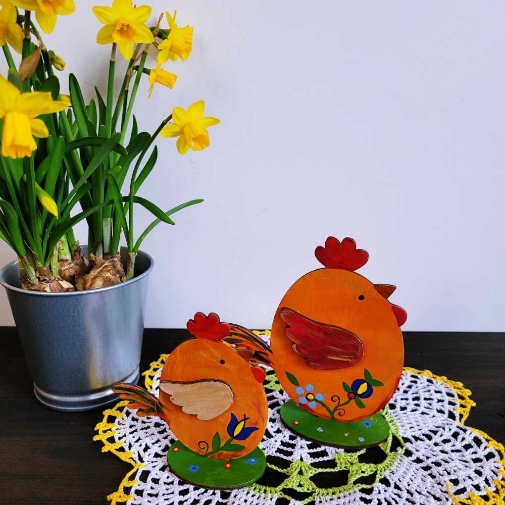 Uroczy zestaw dwóch drewnianych kurek wielkanocnych na stabilnych podstawkach, które wprowadzą do wnętrza wiosenny i regionalny klimat.
