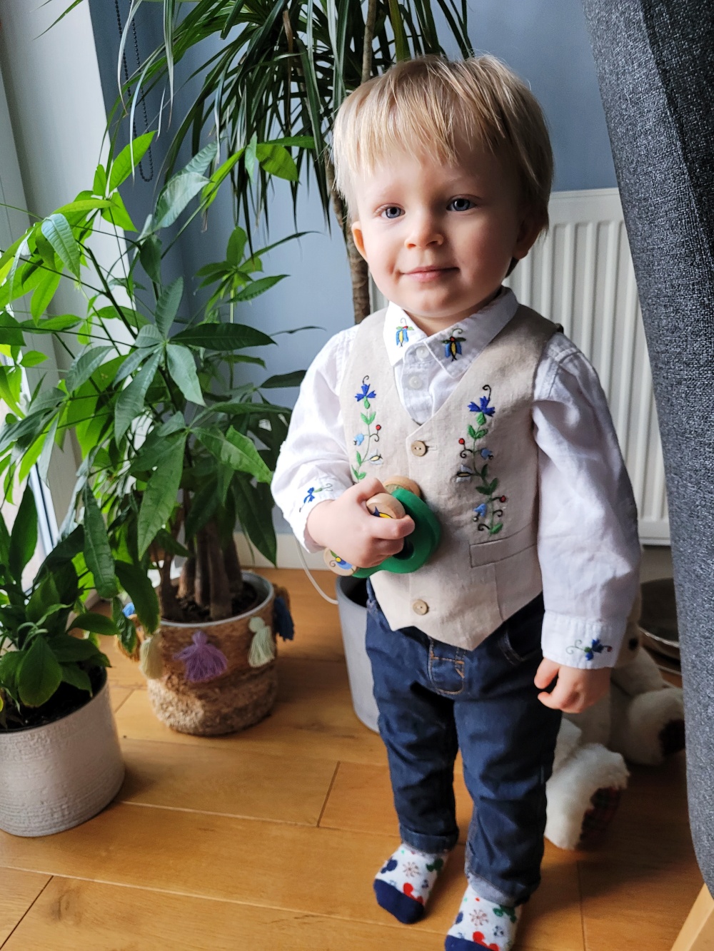Elegancka kamizelka chłopięca z naturalnego lnu z delikatny wzorem kaszubskim. Dyskretne patki, kokosowe guziczki. Genialne uzupełnienie stylizacji Małego Kaszuba! Kamizelka bardzo trwała , wykonana solidnie.
