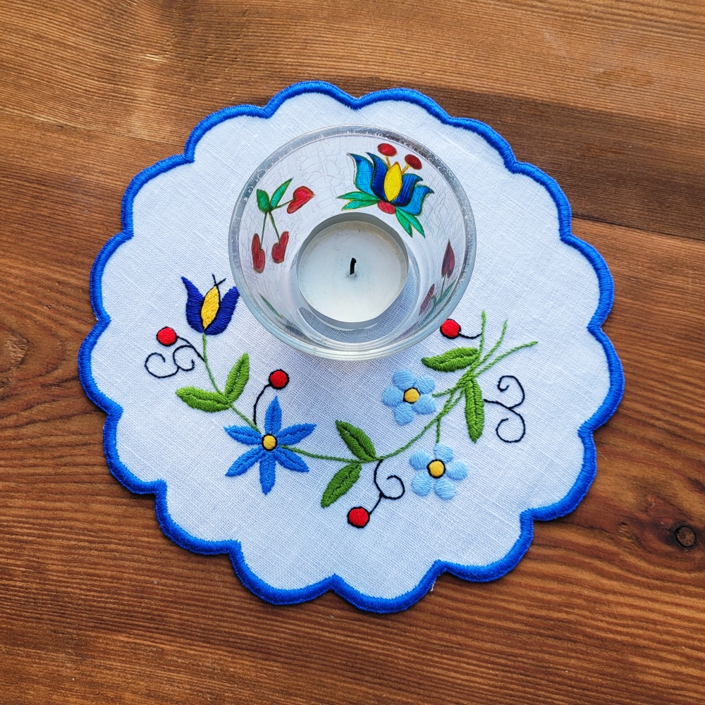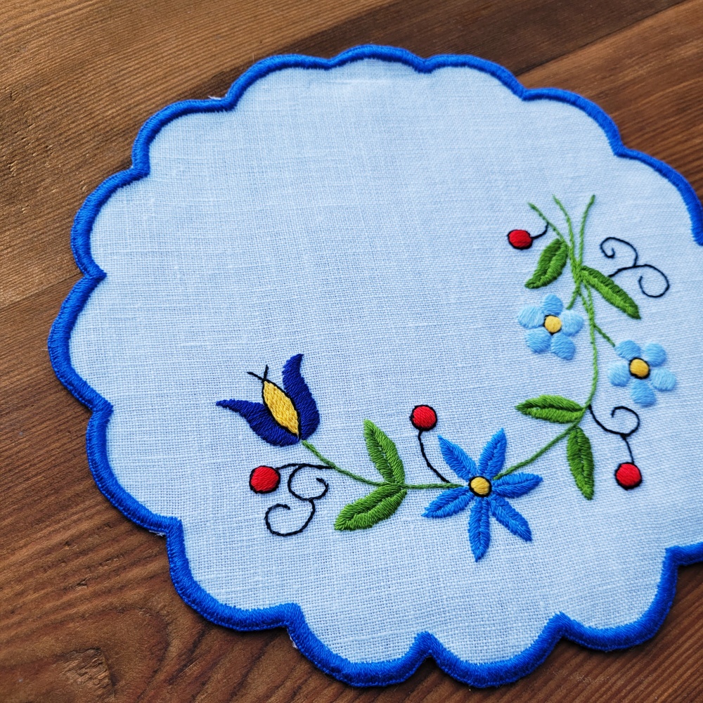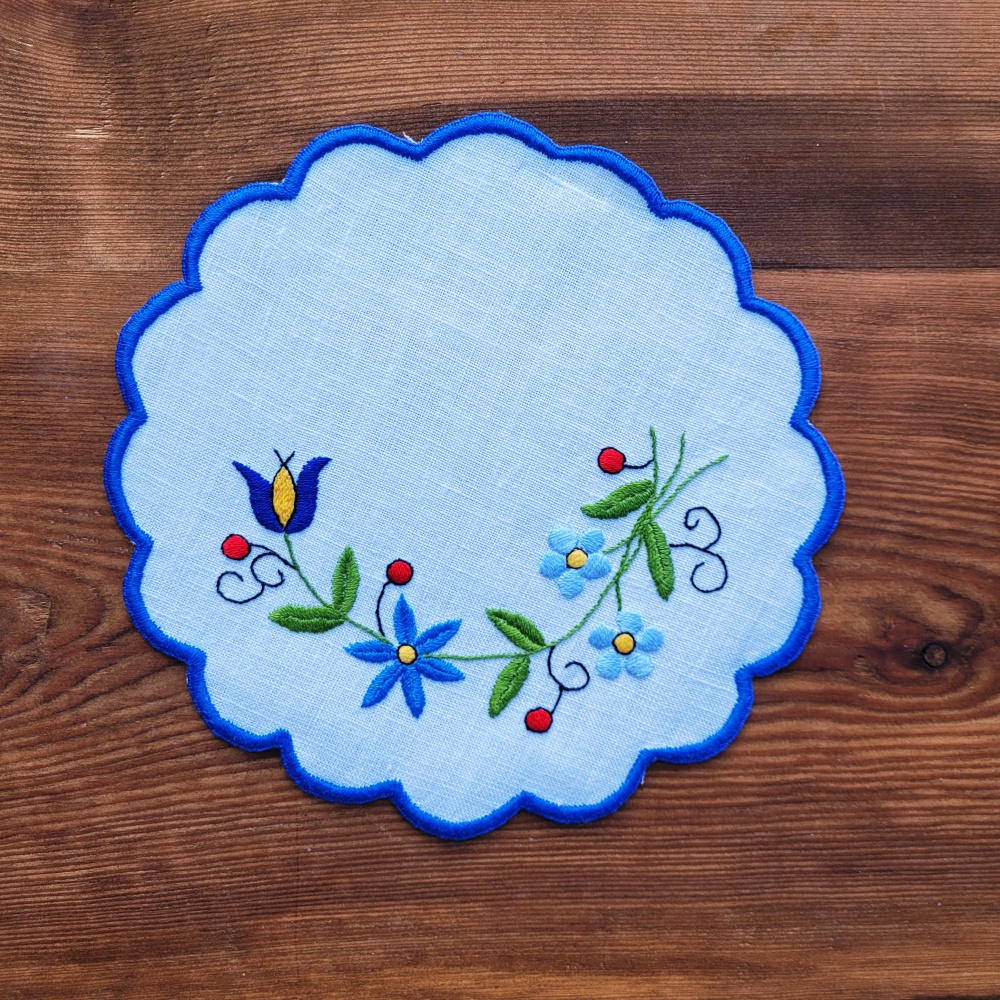 Elegancka, okrągła serwetka lniana w kolorze białym, ozdobiona ręcznie wykonanym haftem kaszubskim. Motyw haftu nawiązuje do tradycyjnej ornamentyki kaszubskiej, a całość została dodatkowo haftowana wokół, co podkreśla jej dekoracyjny charakter.