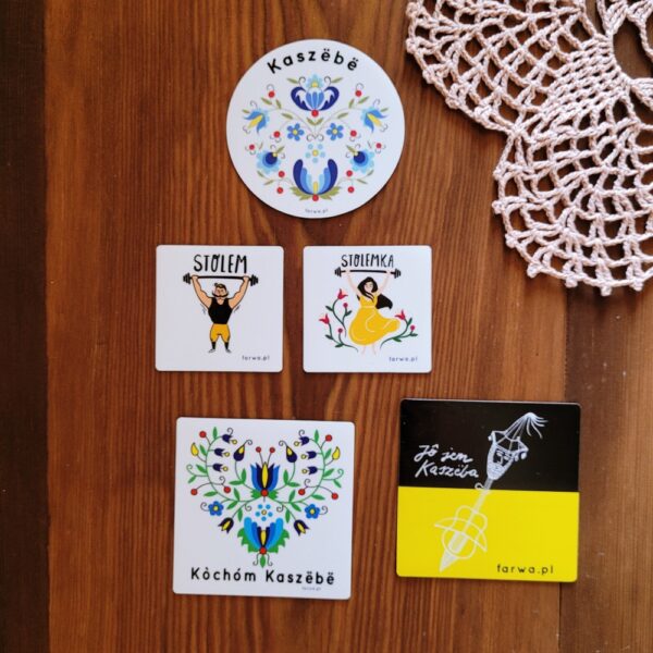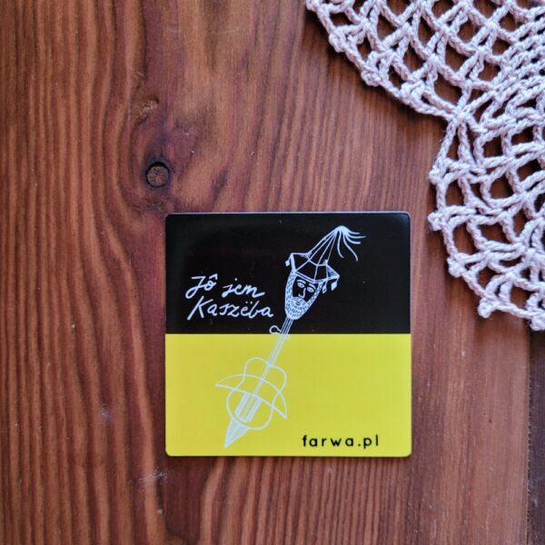 Wodoodpornych magnes z laminatem błyszczącym. Wzór kaszubski w kompozycji koła w siedmiu tradycyjnych kolorach.
