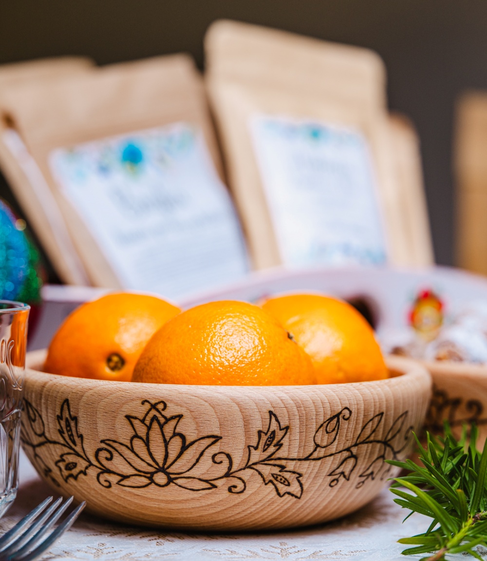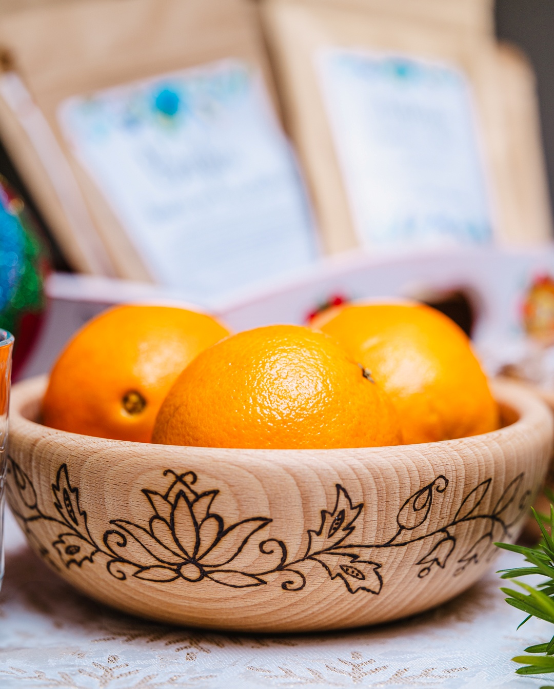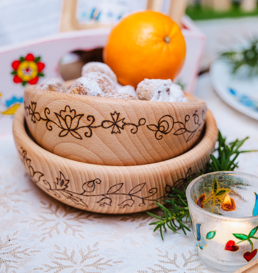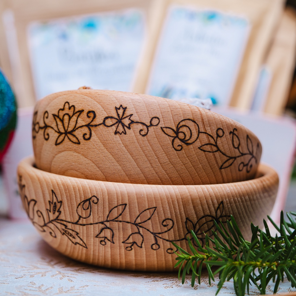 Miska drewniana z ręcznie wypalonym wzorem kaszubskim dookoła miski na zewnątrz