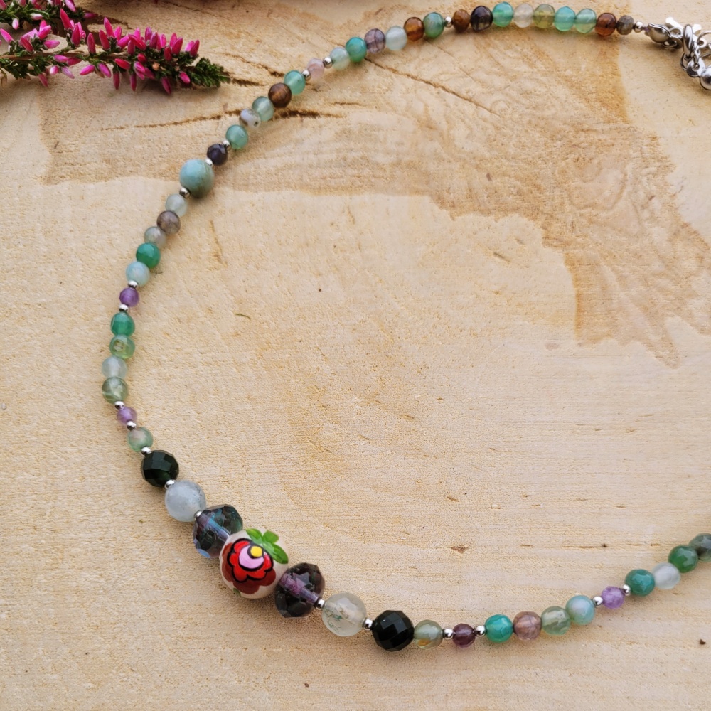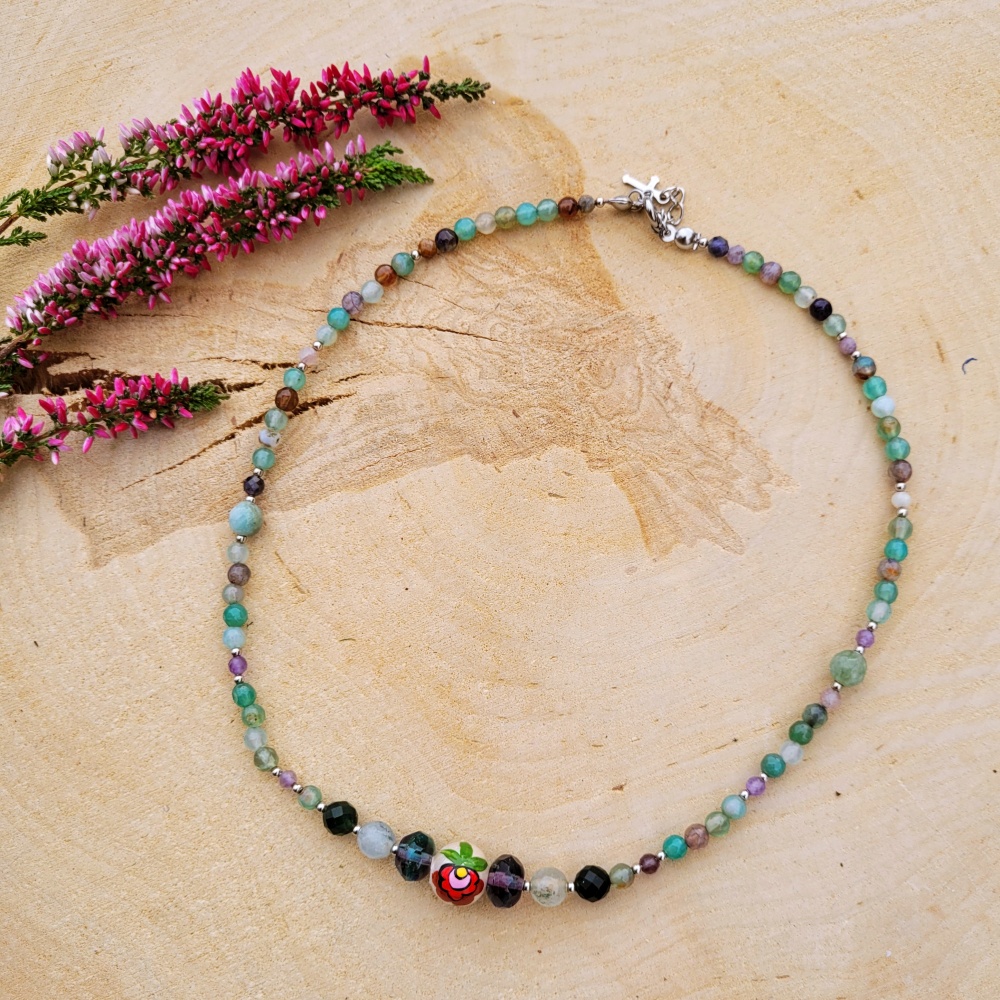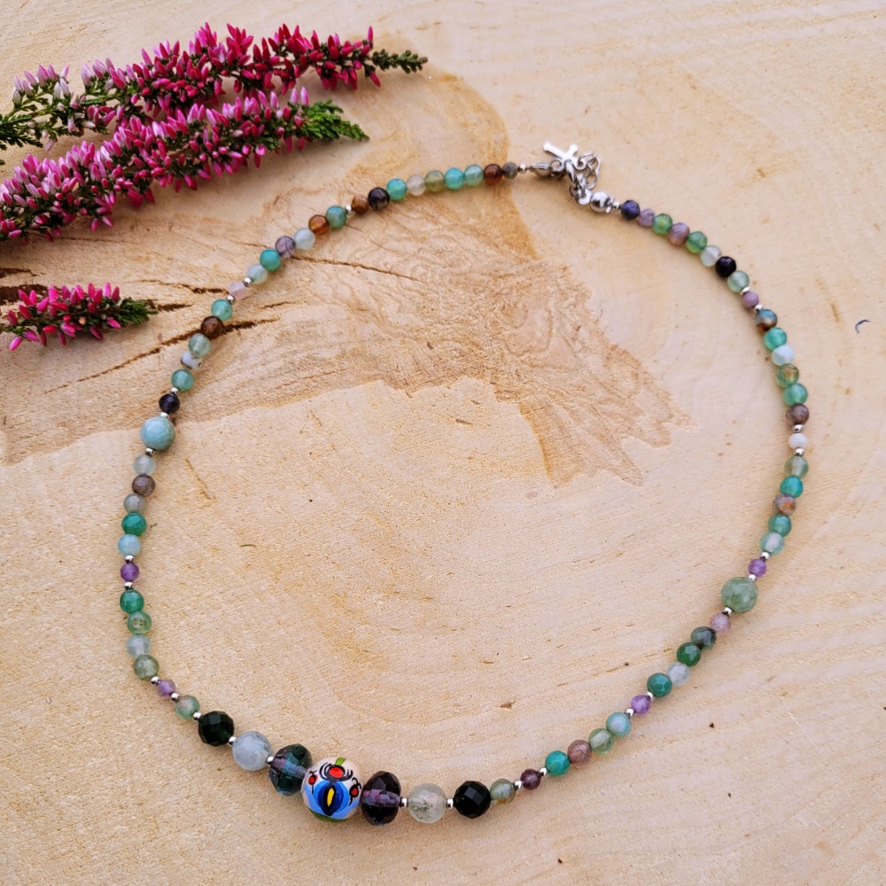 Nowoczesny, delikatny naszyjnik. Kamienie naturalne: sodalit, kryształ górski, nefryt, Agat indyjski oraz stal chirurgiczna. Naszyjnik tworzy subtelną kompozycję kolorów i kształtów.