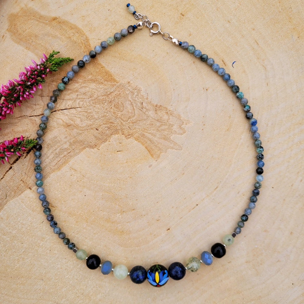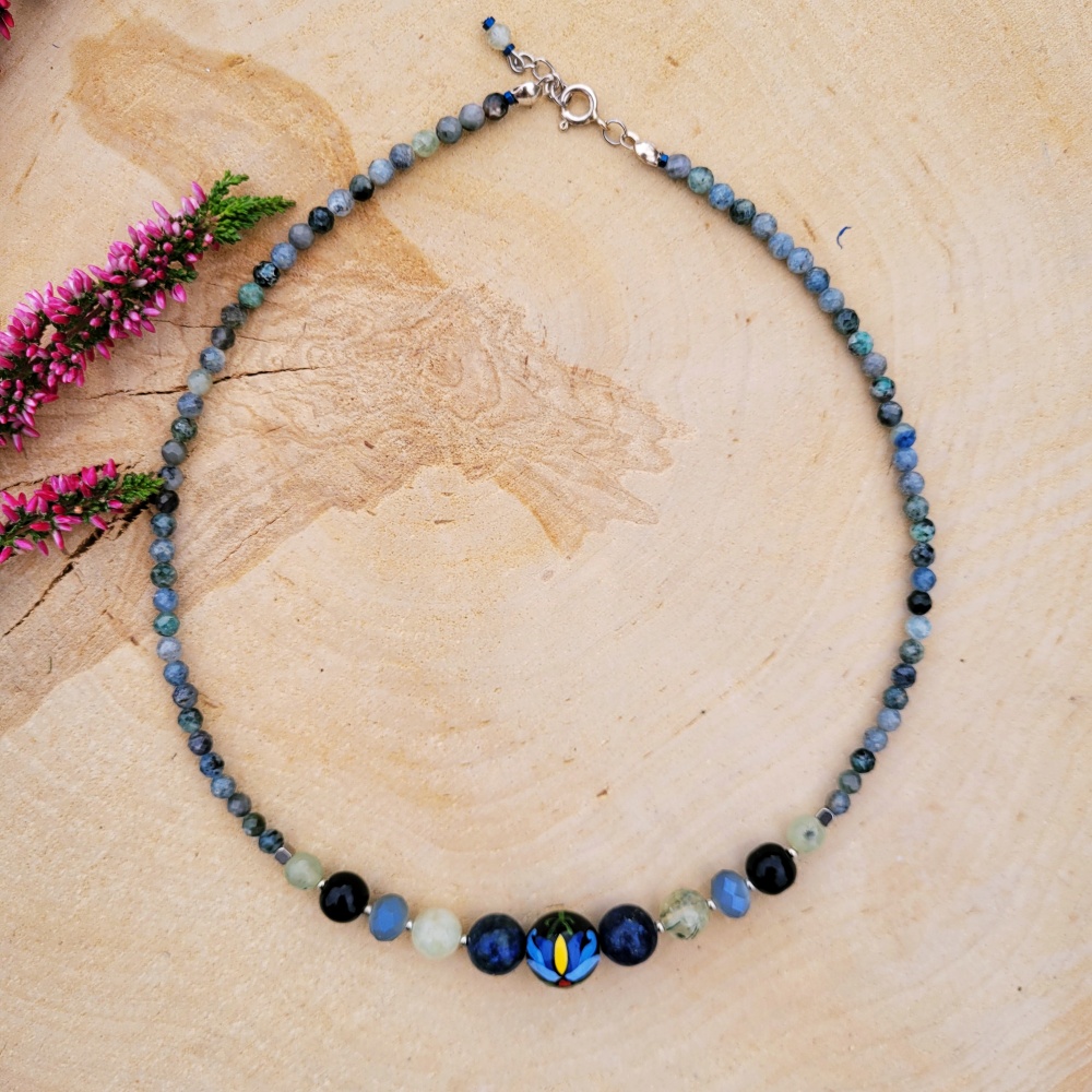 Nowoczesny, delikatny naszyjnik. Kamienie naturalne: sodalit, kainit, Agat indyjski, jadeit oraz stal chirurgiczna złota. Naszyjnik tworzy subtelną kompozycję kolorów i kształtów.
