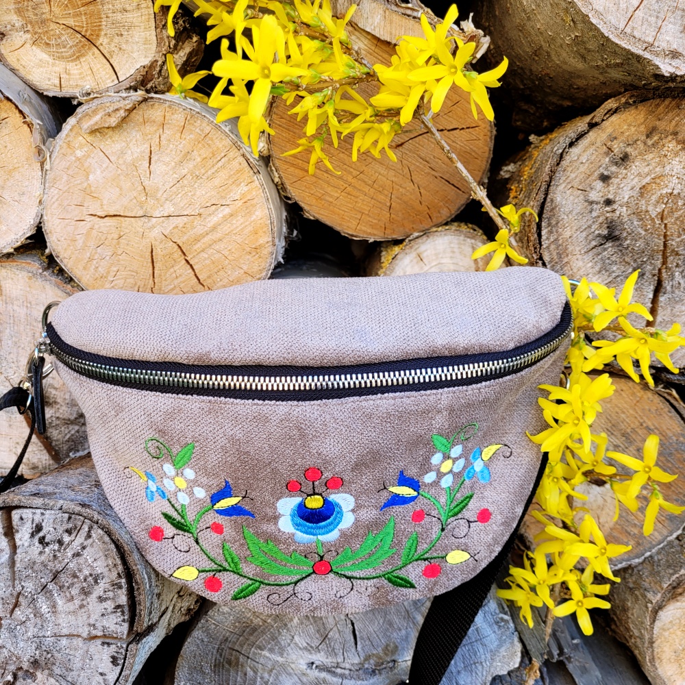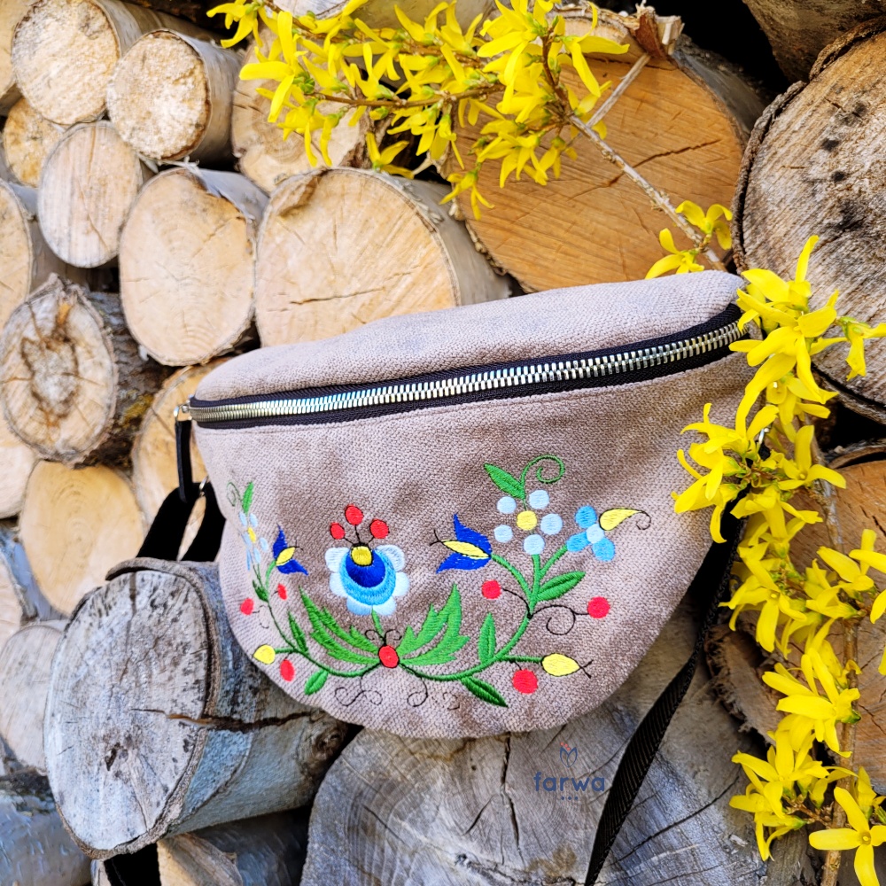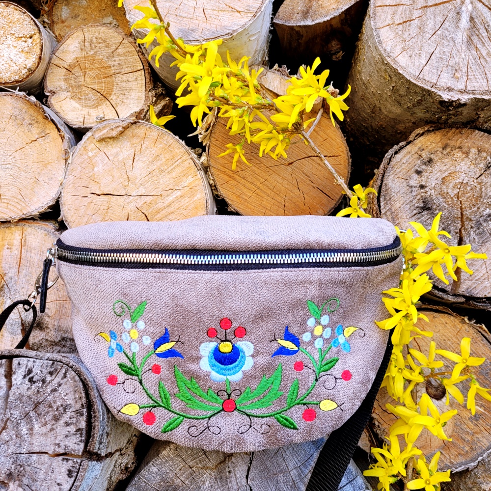Nerka wzór kaszubski Oryginalna nerka z klapą zdobioną motywem kaszubskim, haftowanym maszynowo. Nerka posiada komorę, wyścieloną od wewnątrz bawełnianą podszewką.