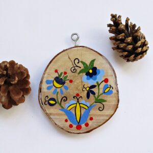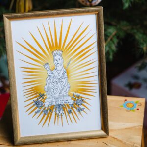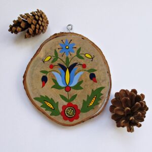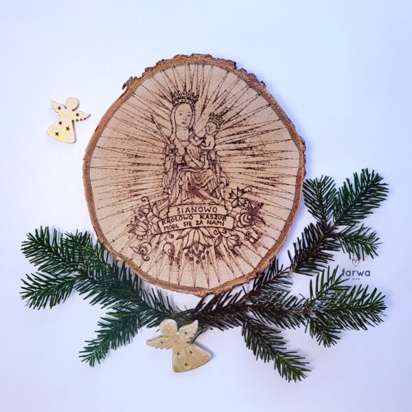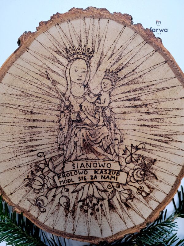 Matka Boska Sianowska – Królowa Kaszub – ręcznie wypalona na plastrze drewna.