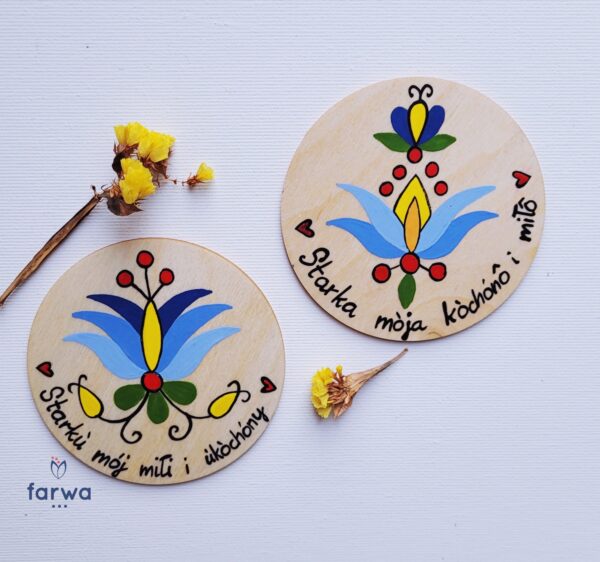 Podstawka , jednostronnie z ręcznie malowanym wzorem Kaszubskim oraz napisem w języku kaszubskim : "Starkù mój miłi i ùkòchóny" i "Starka mója kòchónô i miłô". Strona malowana zabezpieczona kilkoma warstwami lakieru, przystosowane do mycia oraz wysokich temperatur. Średnica 10cm. Idealna na mały i miły upominek dla Babci i Dziadka 🙂