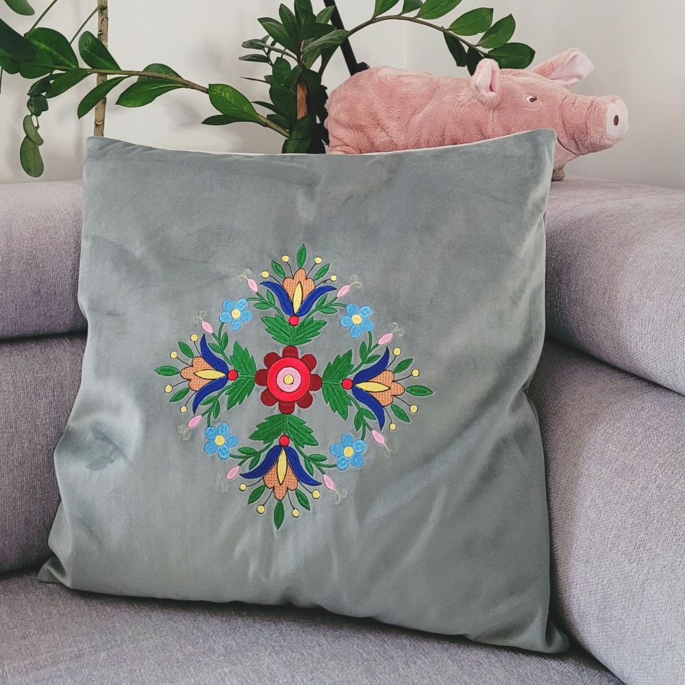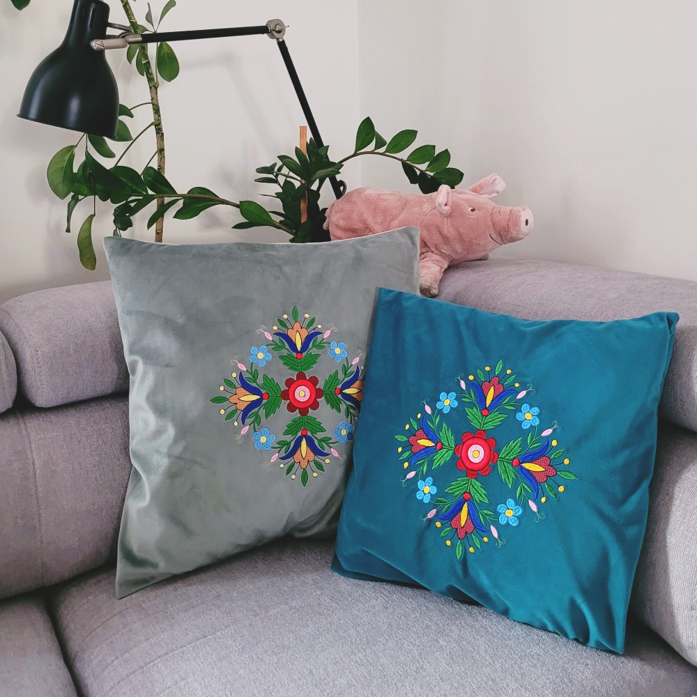 Poszewka na poduszkę we wzory haftu kaszubskiego – haft wdzydzki wykonany maszynowo.
