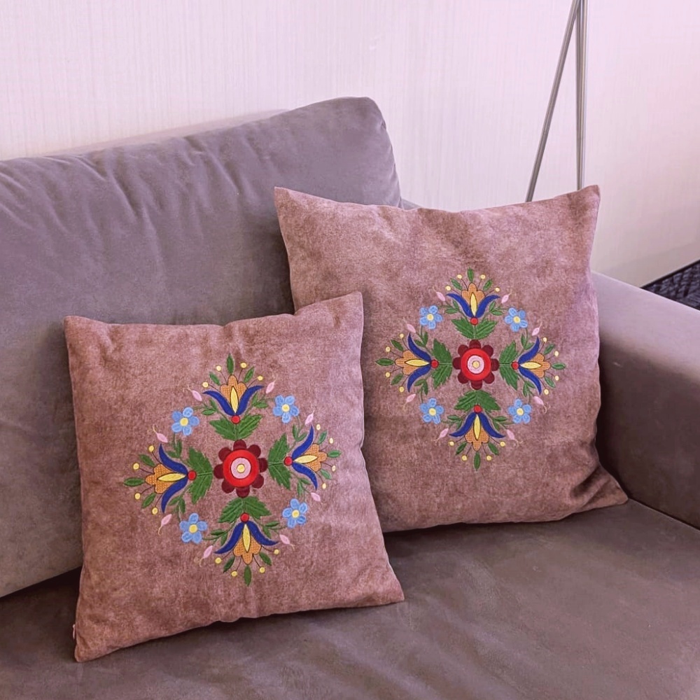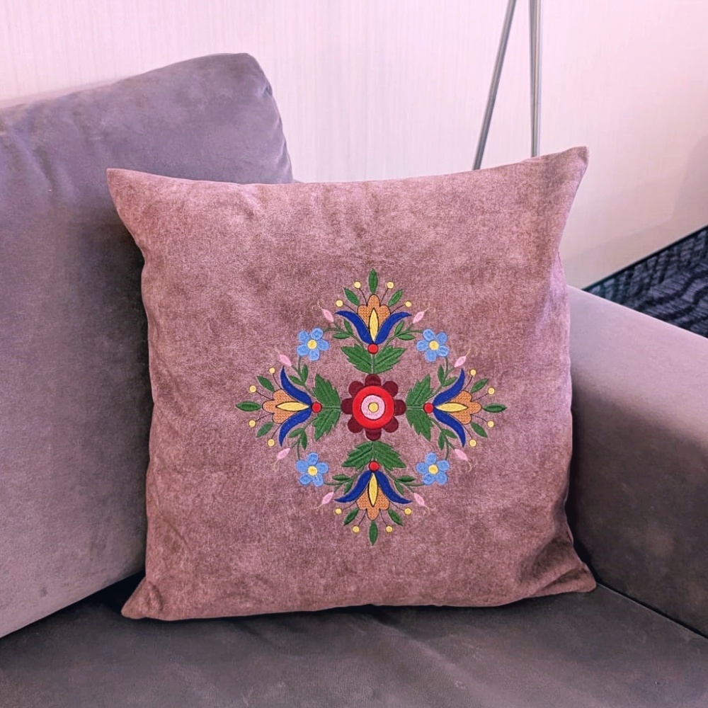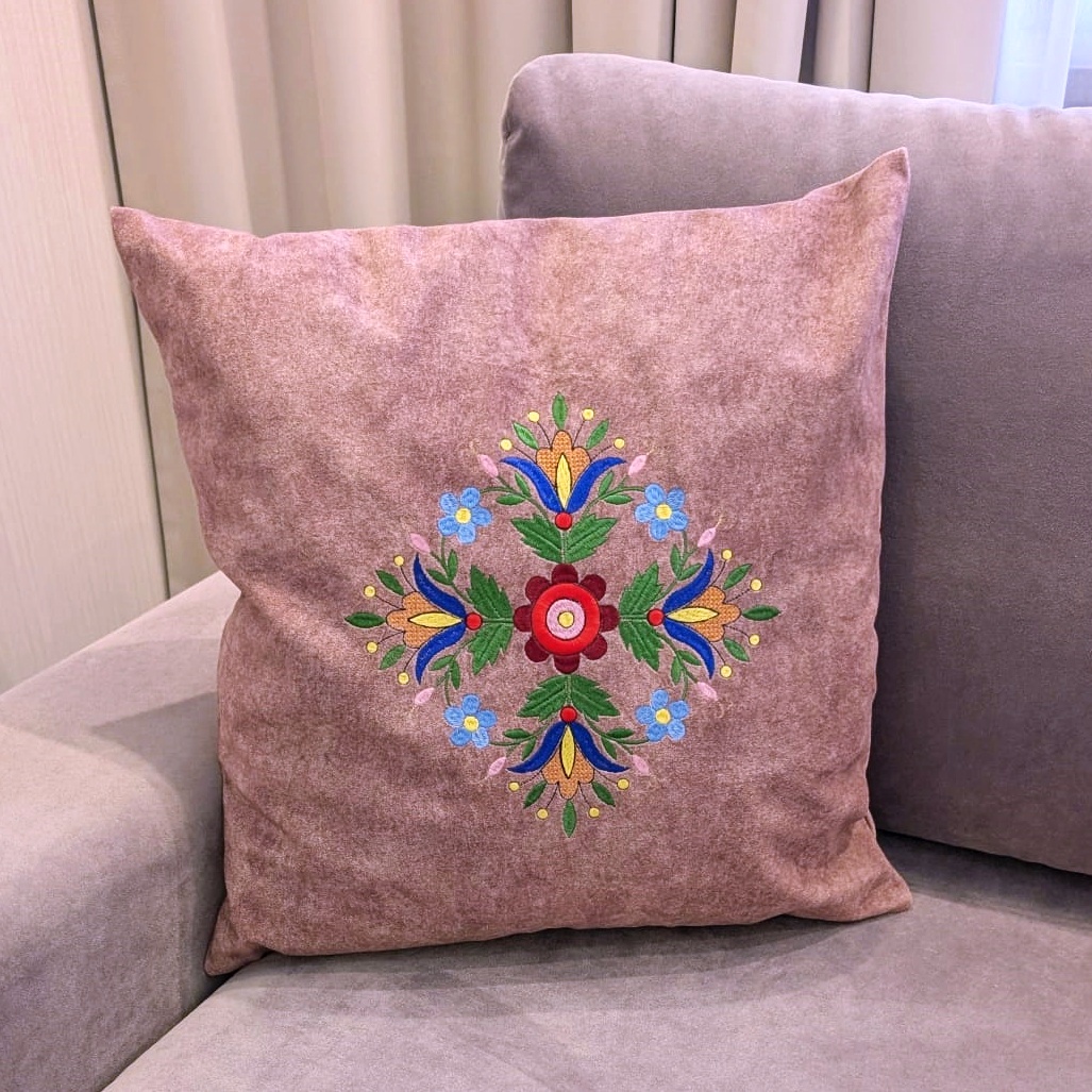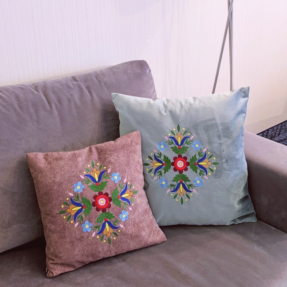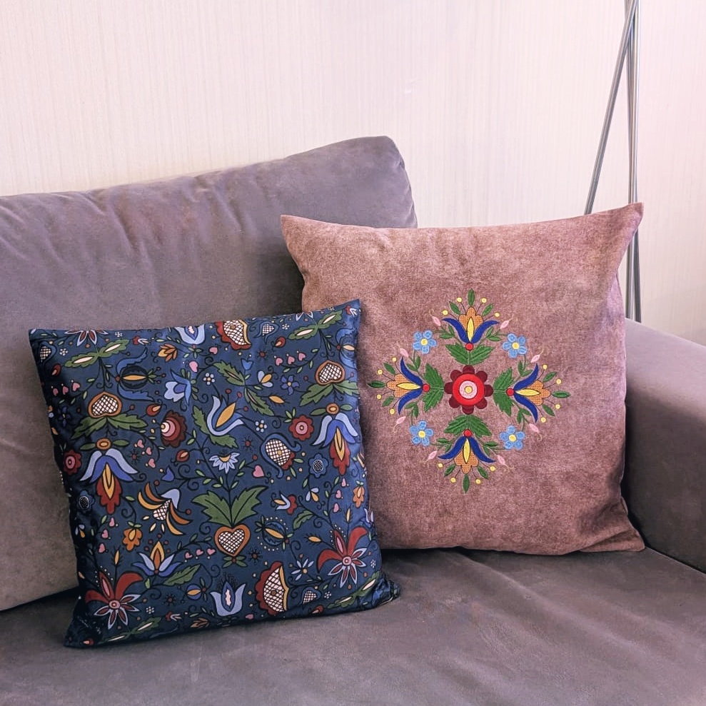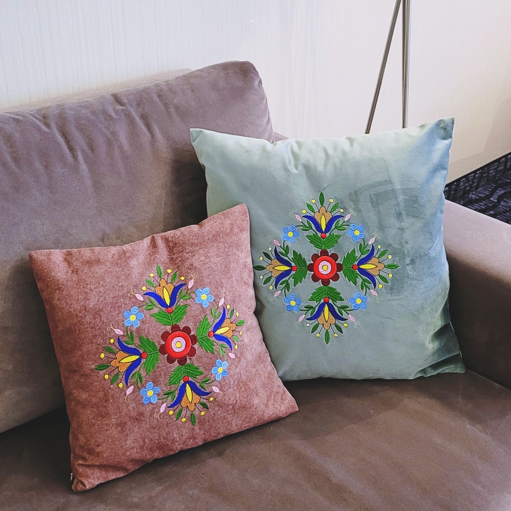 Poszewka na poduszkę we wzory haftu kaszubskiego – haft wdzydzki wykonany maszynowo.