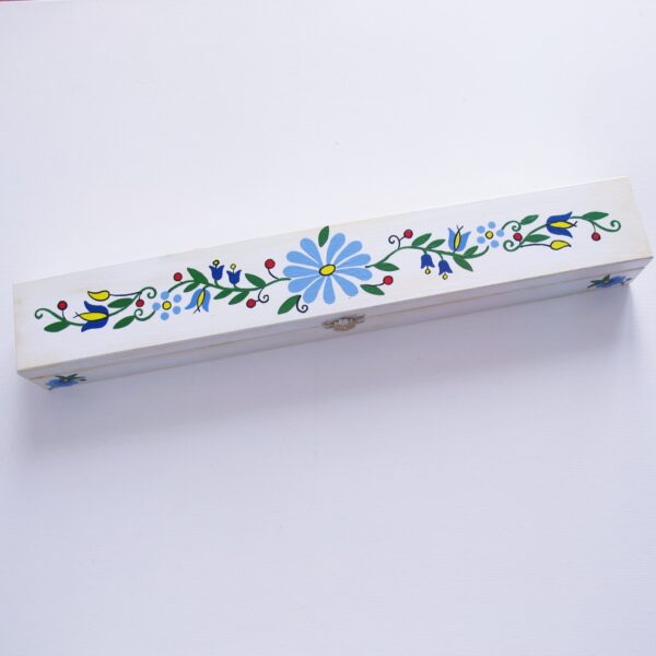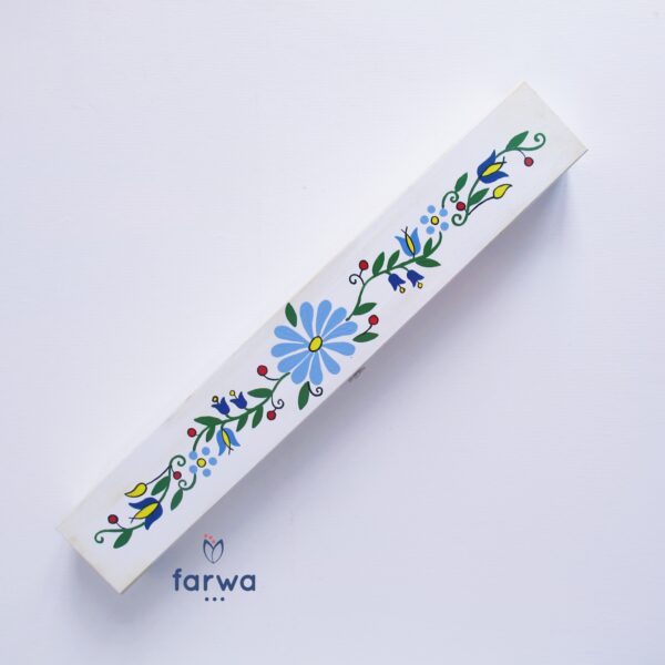 Drewniane pudełko na świecę, ozdobione haftem kaszubskim ręcznie malowanym.