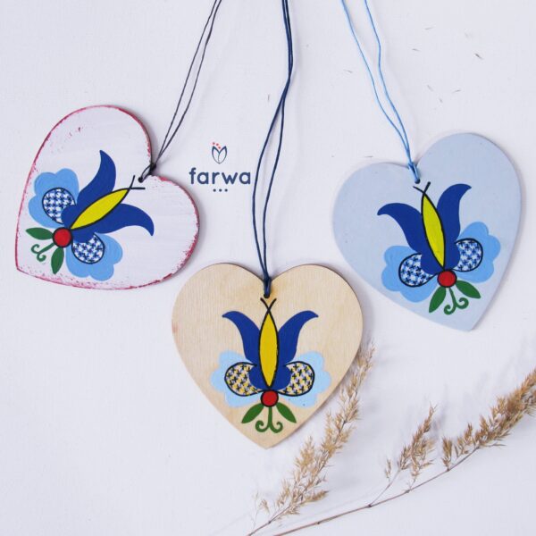 Serce wycięte jest z drewnianej sklejki, ręcznie malowane farbą akrylową i zabezpieczone lakierem.