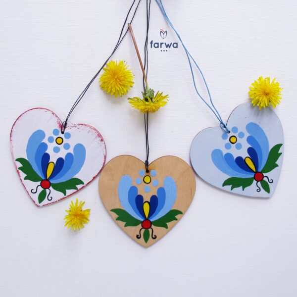 Serce wycięte jest z drewnianej sklejki, ręcznie malowane farbą akrylową i zabezpieczone lakierem.