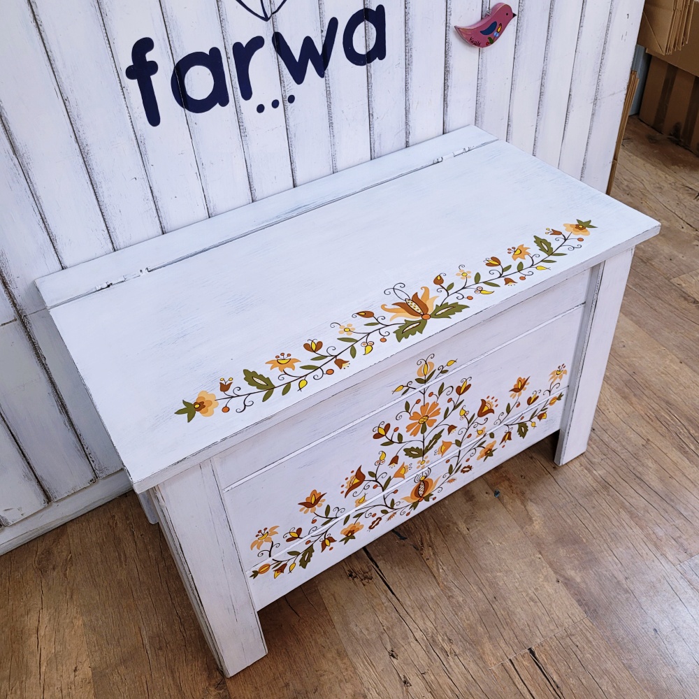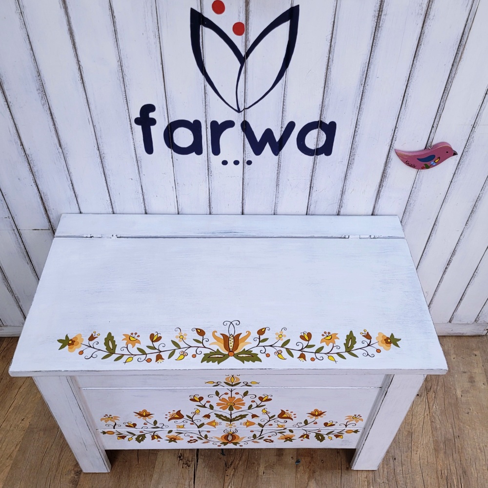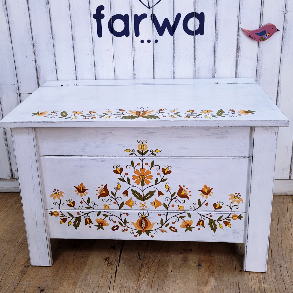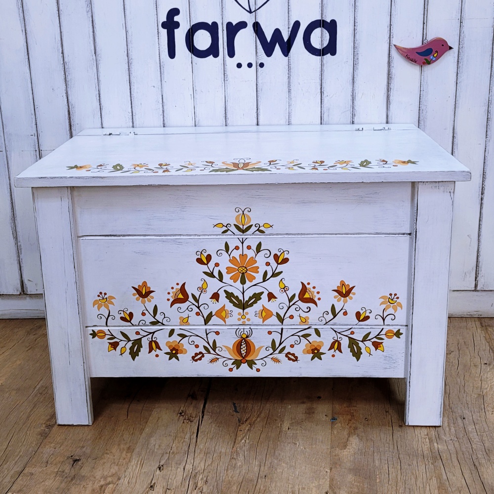 Dzięki dużej pojemności skrzynia doskonale sprawdzi się jako schowek na pościel, ubrania, zabawki czy inne domowe przedmioty. To praktyczne i estetyczne rozwiązanie, które wnosi do wnętrza ciepło oraz ludowy charakter.