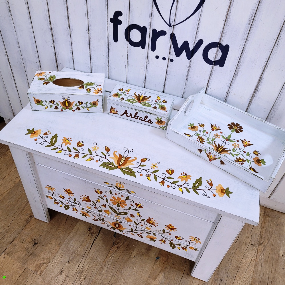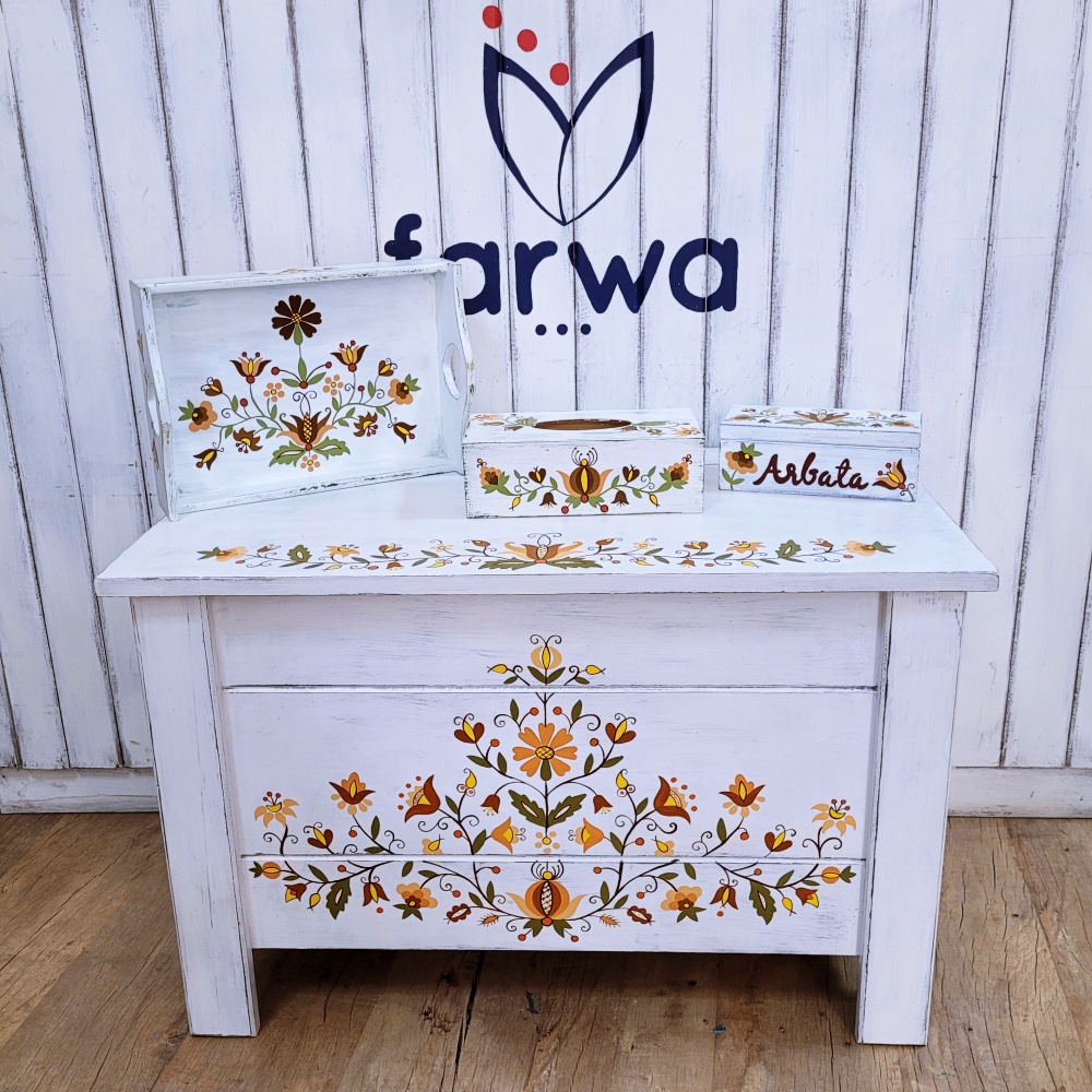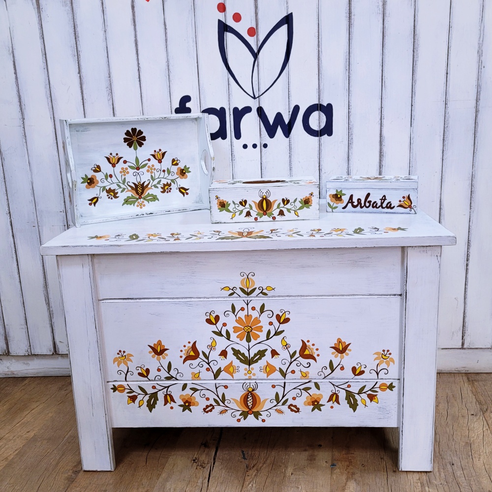 Skrzynia kaszubska borowiacka to wyjątkowy, ręcznie wykonany mebel inspirowany tradycyjnym wzornictwem kaszubskim. Każdy egzemplarz jest malowany ręcznie przez lokalnego rzemieślnika, dzięki czemu stanowi unikatową ozdobę wnętrza i niepowtarzalny element wystroju.