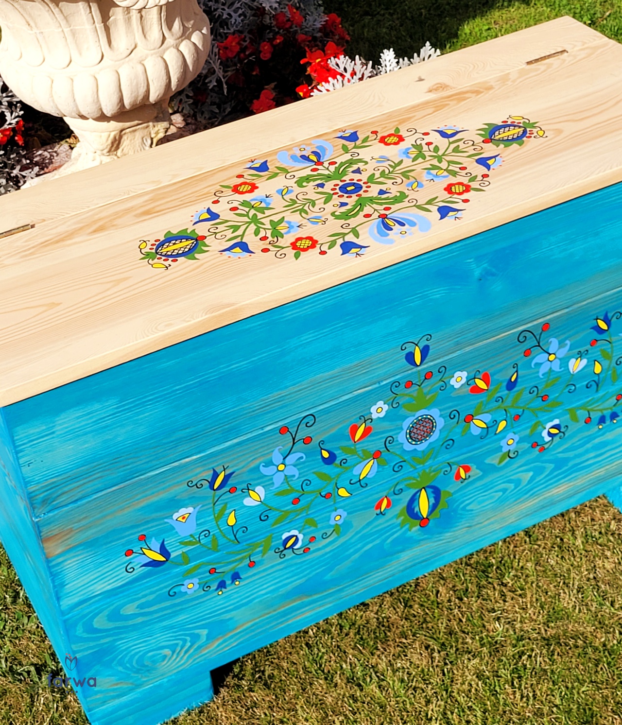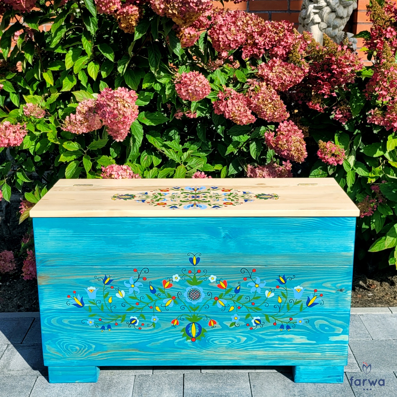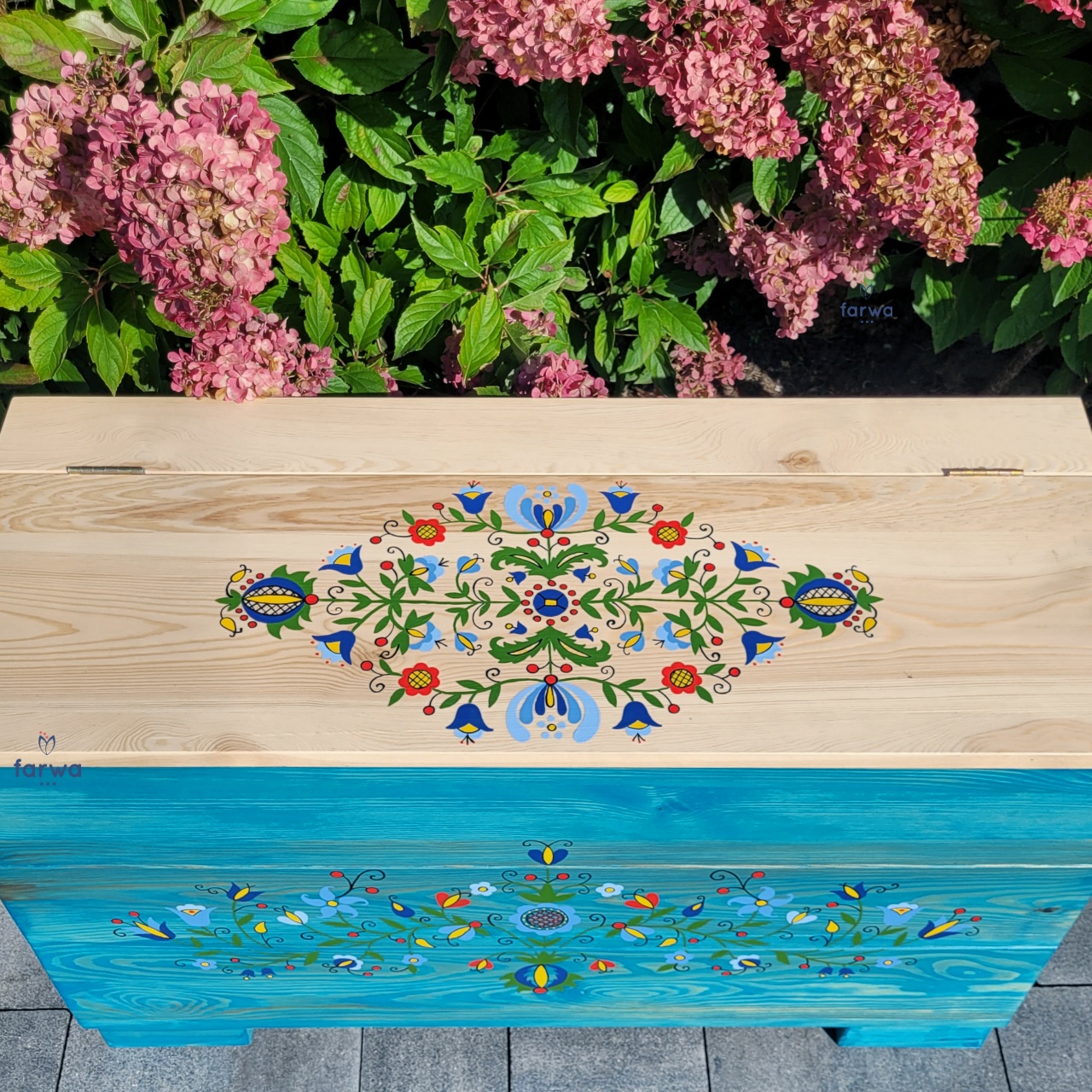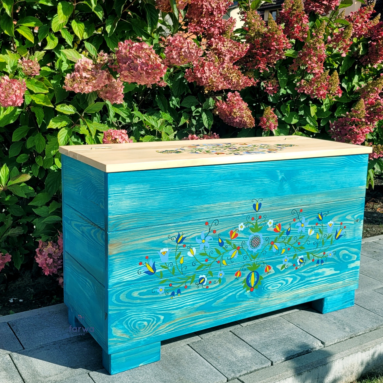 Skrzynia Kaszubska ręczne malowana we wzory haftu Kaszubskiego. W siedzisko Lita sosna (lub świerk w zależności od dostawy)- deska o grubości aż 15mm Skrzynia idealnie ozdobi Twoje mieszkanie i nada wnętrzu niepowtarzalny klimat. Skrzynia jest bardzo solidna – wykonana z grubego drewna. Spokojnie można na niej siadać. Jest bardzo pojemna – zmieści w niej się pościel, wielka sterta prania, zabawki dzięcięce, itd. Solidne, zdrowe drewno skrzyni oraz staranne ozdabianie sprawi, że mebel będzie mógł stać się pamiątką rodzinną przekazywaną z pokolenia na pokolenie. Możliwość dostosowania. Możliwe jest wykonanie skrzyni na indywidualne zamówienie – dowolny styl zdobienia, motywy, kolorystyka i rozmiar skrzyni.