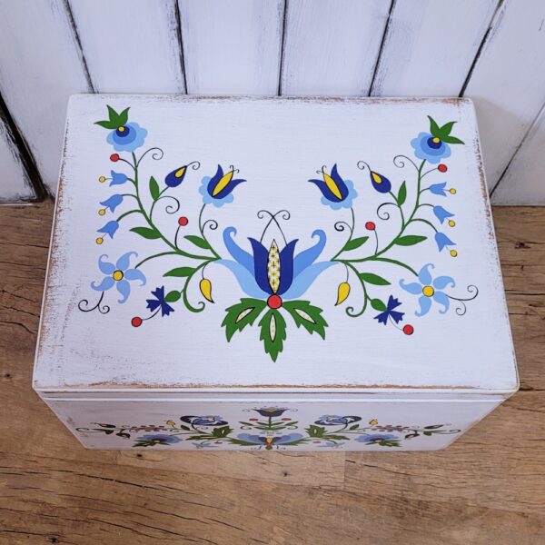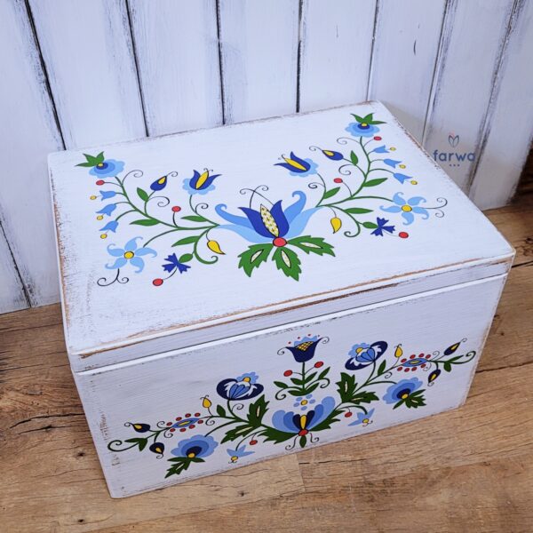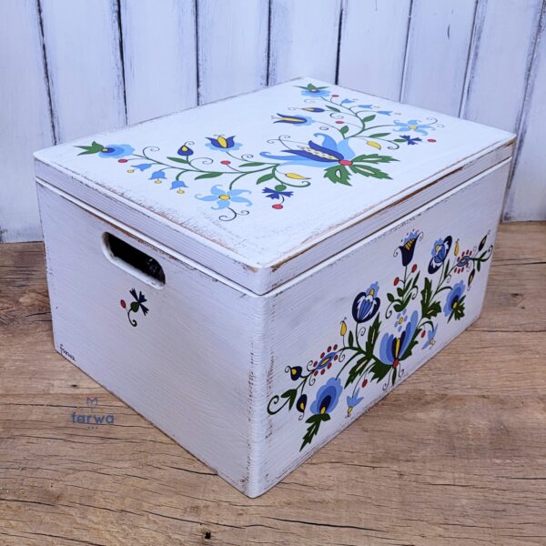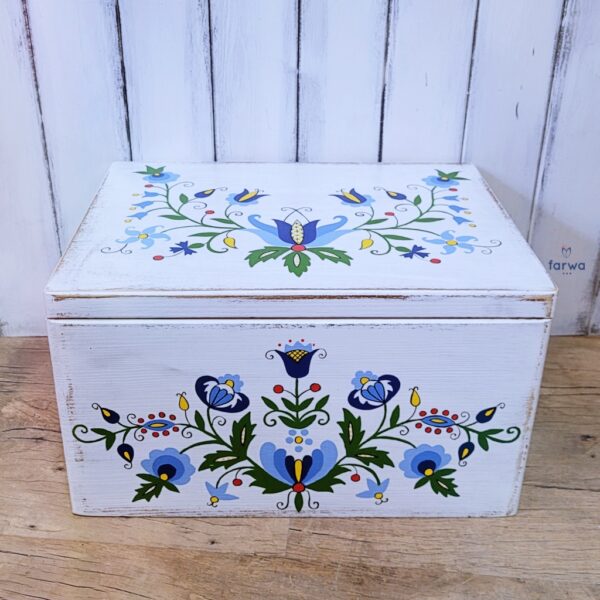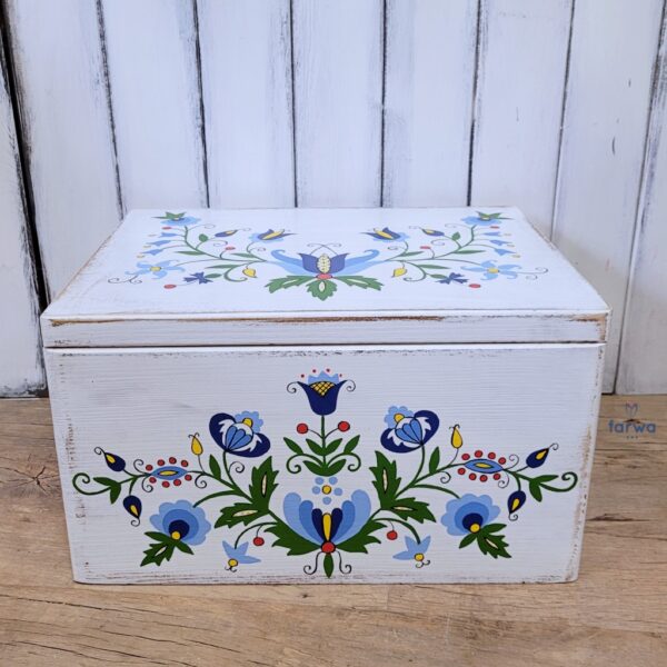 A large box Kashubian, white, wood, antiqued and hand painted in the whole pattern Kashubian, the whole protected with lacquer. Dimensions: length 40 cm, width 30 cm, height 38 cm.