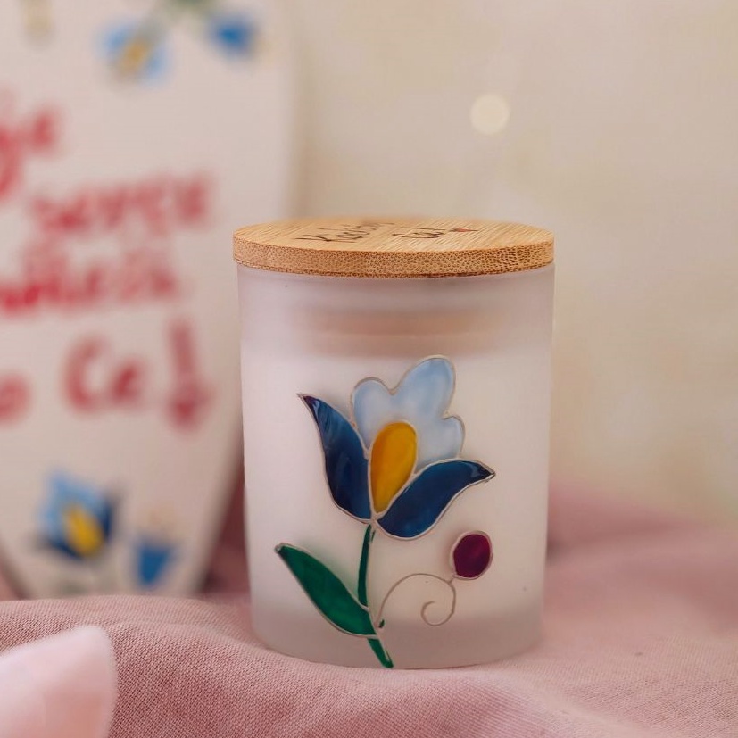 Każda świeca jest wykonywana ręcznie, a jej wyjątkowość podkreśla ręcznie malowany wzór kaszubski, uzupełniony złotą konturówką. Na drewnianej pokrywce wypalony został napis