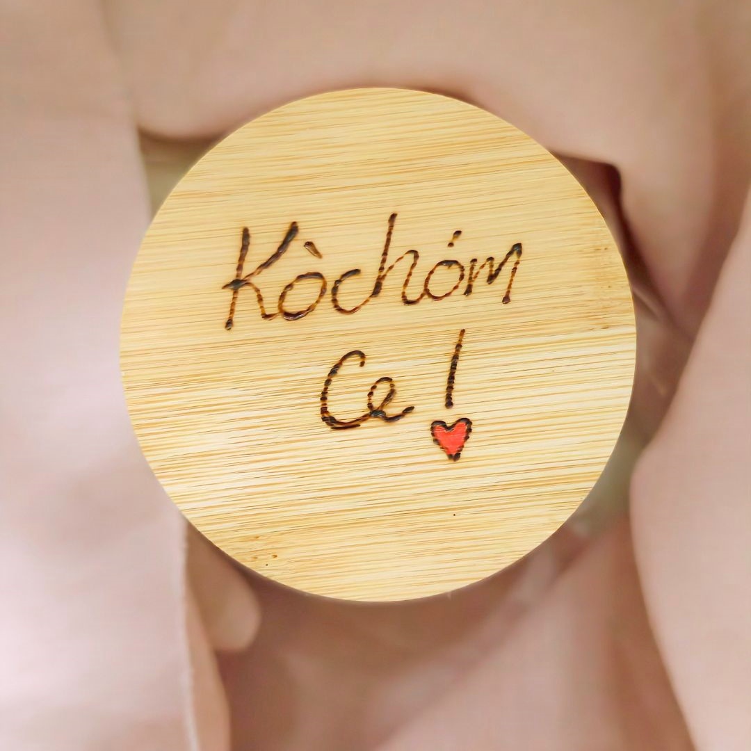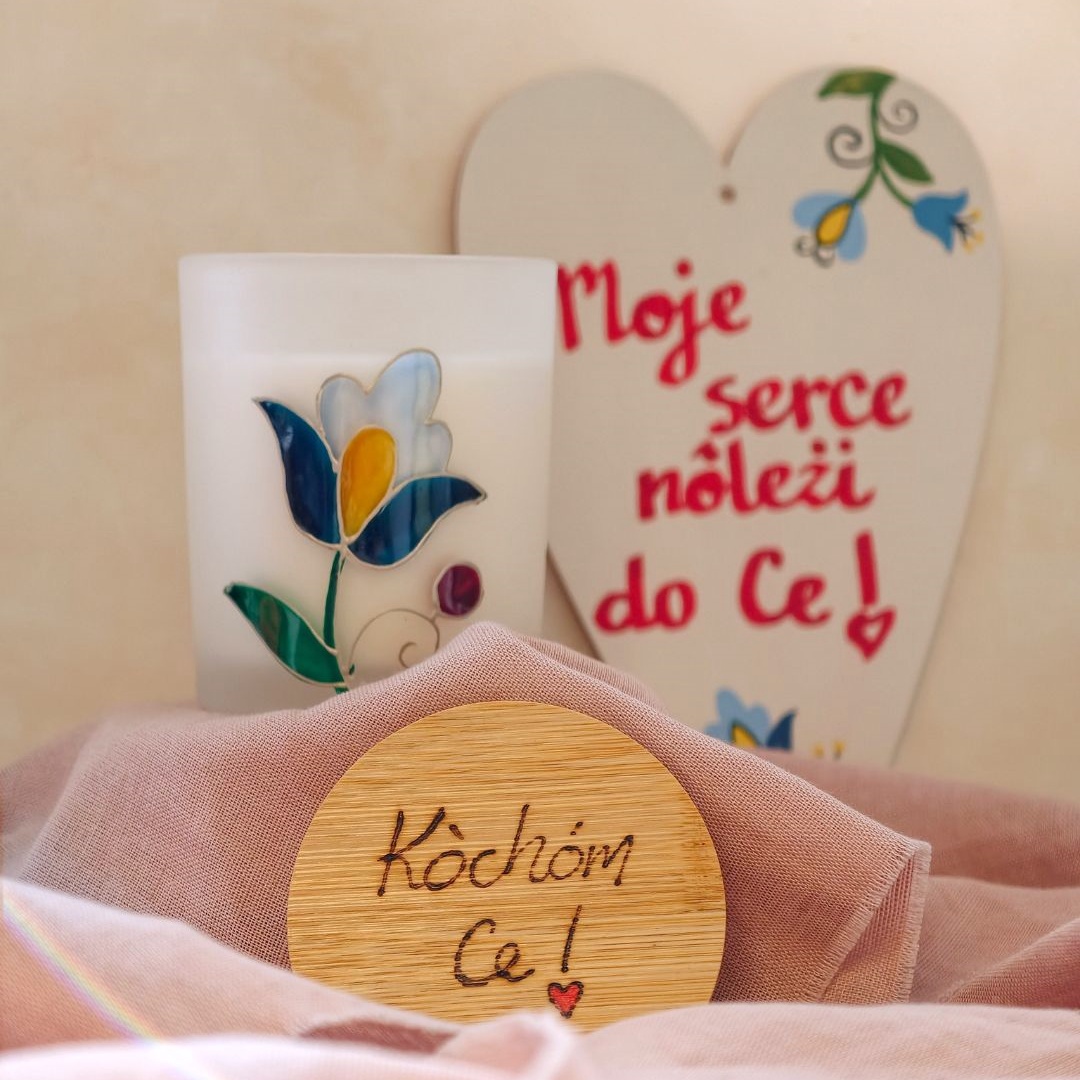 „Kòchóm Ce” – Kocham Cię, wraz z delikatnym kaszubskim motywem dekoracyjnym.