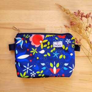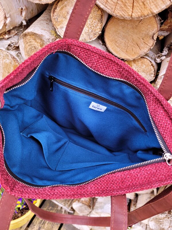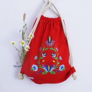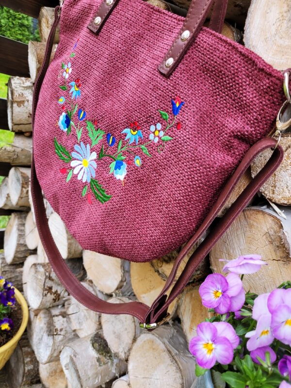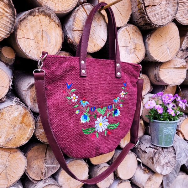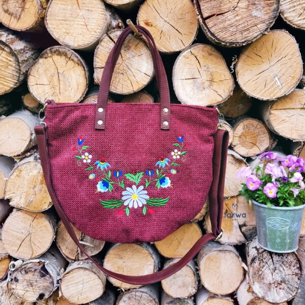 Torebka została uszyta z grubej tkaniny tapicerskiej w intensywnym odcieniu głębokiego fioletu z domieszką bordo. Materiał ten cechuje się wyraźną, lekko surową fakturą, przypominającą len lub mocną bawełnę, co nadaje całości subtelnie rustykalny charakter. Przednią część zdobi wielobarwny haft maszynowy w stylu żukowskim – typowy dla kaszubszczyzny motyw roślinny z centralnym, białym kwiatem, uzupełniony misternymi listkami oraz kolorowymi detalami w tonacjach zieleni, błękitu, żółci i czerwieni. Takie zestawienie sprawia, że tasza staje się niepowtarzalnym dodatkiem, podkreślającym indywidualność właścicielki.