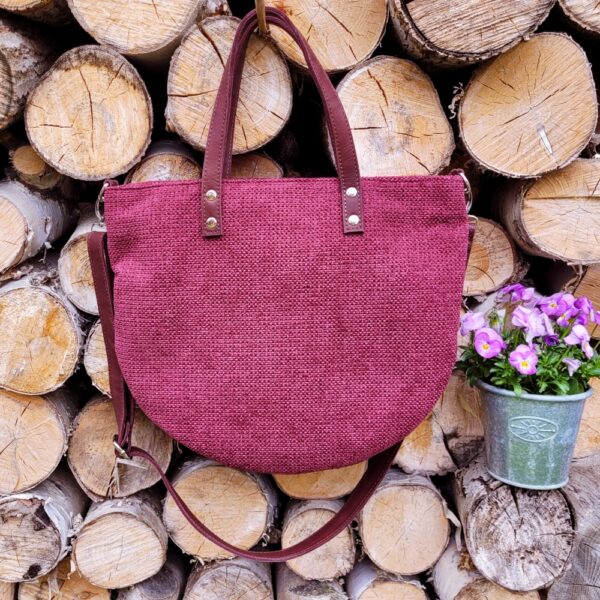 Materiał: tkanina tapicerska w kolorze ciemnego różu. Torebka zapinana jest na zamek błyskawiczny.