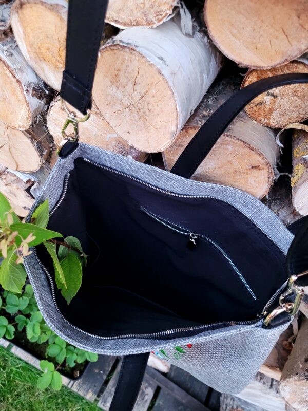 Środek: wytrzymała, czarna podszewka drelich. Trzy funkcjonalne kieszonki. Jedna większa zamykana jest na zamek błyskawiczny, dwie pozostałe są mniejsze np. na telefon.